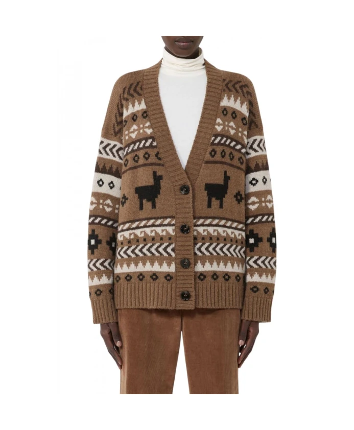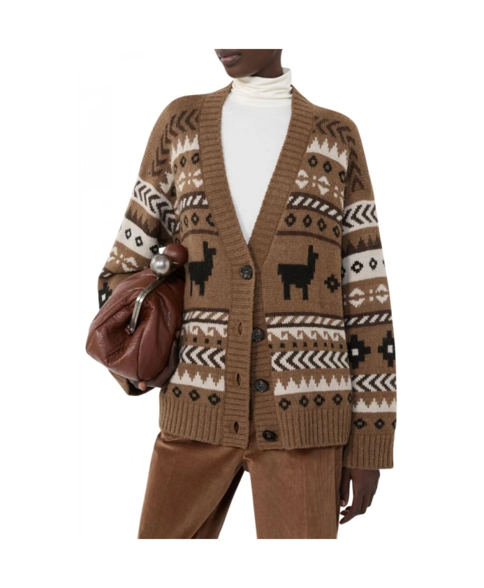 Кардиган Weekend Max Mara Ovatta - это объемный жаккардовый кардиган, созданный для комфортного многослойного образа и сохранения тепла. V-образный вырез и застежка на пуговицах делают его универсальной повседневной вещью. Ключевые особенности: Коричневый | Каммелло | Альпака и шерсть | Мягкая пряжа из смеси альпаки | Утепляющая вязка | Застежка на пуговицы | V-образный вырез | Длинные рукава со спущенными плечами | Жаккардовая вязка по всей поверхности | Ребристые края | Размер и посадка: Свободный крой | Состав и уход: 45% акрил | 40% альпака | 15% шерсть | Ручная стирка в холодной воде (макс. 40°C); не отбеливать; не сушить в сушильной машине; сушить в горизонтальном положении в тени; гладить при низкой температуре; профессиональная химчистка (перхлорэтилен, деликатный режим). Не стирать влажным способом.