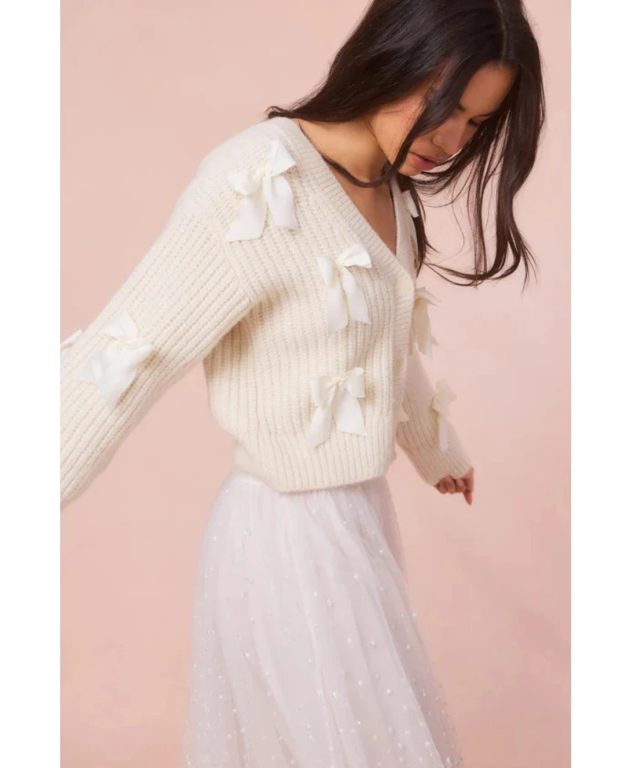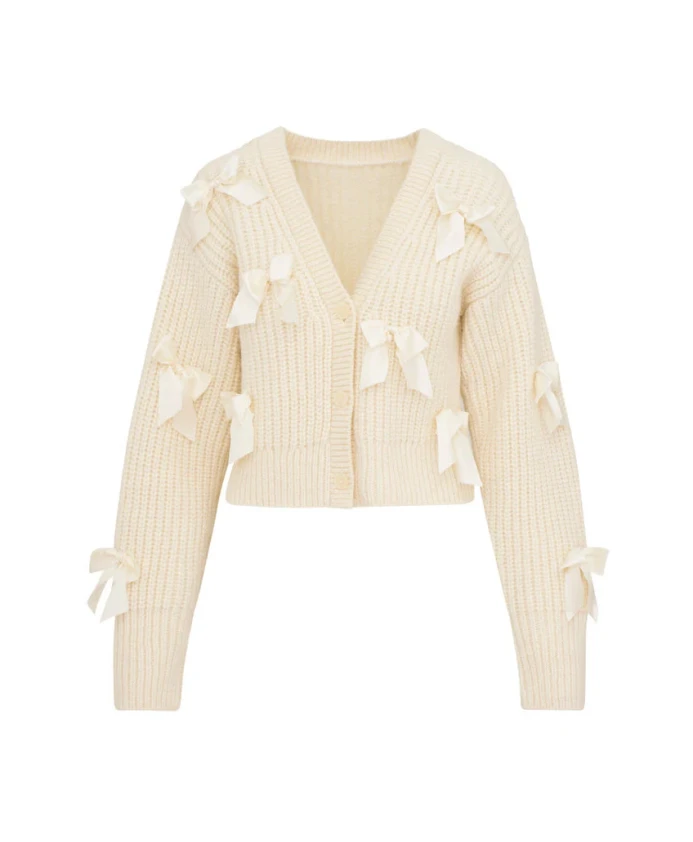 Кардиган LoveShackFancy Ashtan сочетает в себе женственный дизайн с бантами и мягкую альпаку, создавая уютный многослойный образ. Идеально подходит для придания романтического шарма летним нарядам. Ключевые особенности: Бежевый | Смесь детской альпаки | Ультрамягкий | Теплый, утепляющий слой | Застежка на пуговицы спереди | Пуговицы из искусственного рога | V-образный вырез | Бантики из шармеза по всей поверхности | Длинные рукава | Размеры и посадка: Длина (размер S): 48,3 см | Обхват груди (размер S): 87,6 см | Длина рукава (размер S): 48,3 см | Состав и уход: 70% детская альпака | 23% нейлон | 7% шерсть | Только химчистка