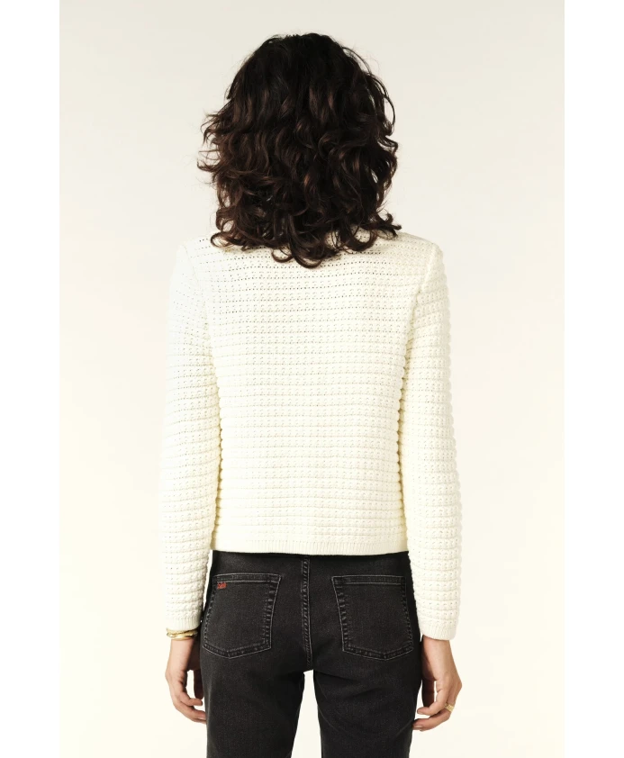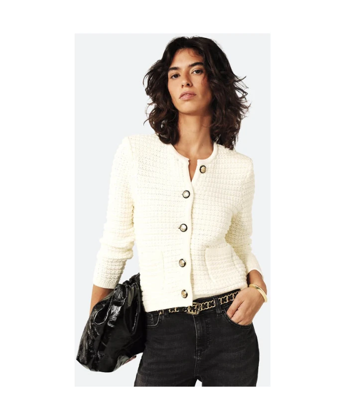 Кардиган GASPARD от Ba&sh невероятно удобен и легко сочетается с любым стилем. Благодаря рукавам до локтя и круглому вырезу горловины он излучает элегантность и современность. Открытые манжеты и пуговицы спереди переливаются на свету, заставляя вас сиять. Техническая вязка в уникальном османском стиле добавляет текстуру и создает неотразимый твидовый эффект. Нам очень нравятся плечевые подкладки, которые придают дизайну структуру и добавляют нотку изысканности. Он идеально сочетается с юбкой или брюками! Материал: 75% хлопок / 25% полиамид. Цвет: Экрю/Белый.