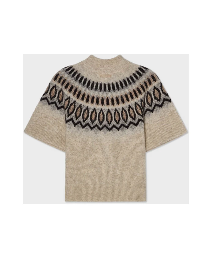 Кардиган Vilanie от Busnel - это кардиган в стиле накидки, изготовленный из роскошной смеси мохера и шерсти, обладающий пушистой и мягкой текстурой. Это изделие жаккардовой вязки с эффектным геометрическим узором идеально подходит для ношения поверх рубашек оверсайз. Ключевые особенности: Жаккард Sandstorm | Бежевый | Мохер | Шерсть | Круглый вырез | Короткие, струящиеся рукава | Три золотые пуговицы B | Размеры и посадка: Соответствует размеру | Состав и уход: 33% мохер | 33% шерсть | 28% нейлон | 6% эластан | Ручная стирка