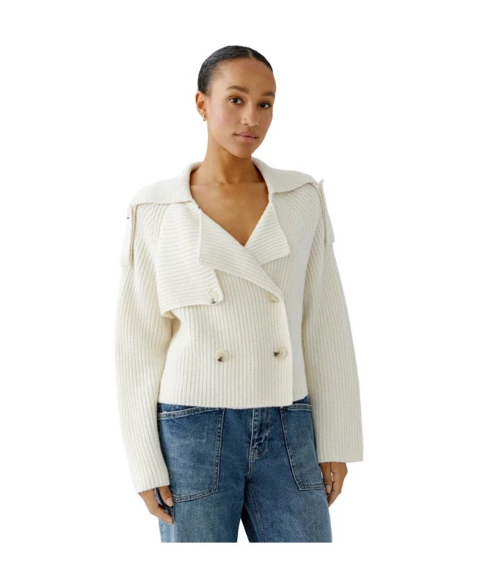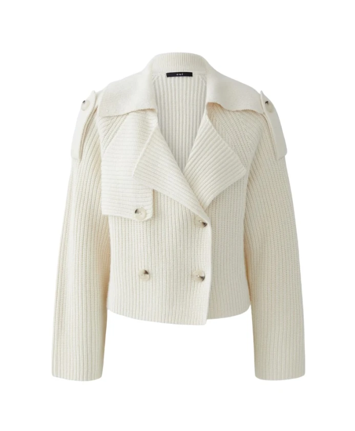 Куртка Oui. Красивый кардиган в стиле тренча. Куртка имеет свободный крой и укороченную длину, соответствует размеру. Особый кардиган, подходящий для самых разных случаев. Изготовлен из прочной ребристой пряжи с добавлением шерсти. Свободный крой, укороченная длина. Большой воротник, усиленный эластаном. Двубортный, с высококачественными пуговицами под рог. Детали тренча: кокетка на груди, погоны на плечах, двубортная передняя и задняя кокетка. 82% полиакрил, 15% шерсть, 3% полиамид. Только химчистка, деликатный режим.