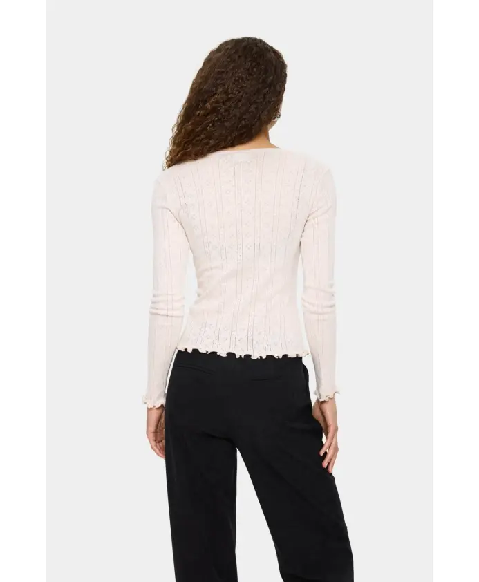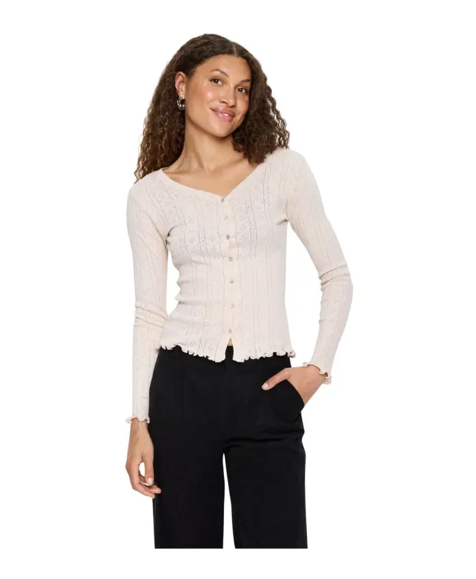 Кардиган Saint Tropez GruSZ - это приталенный кардиган с V-образным вырезом и декоративными пуговицами, созданный для удобного многослойного ношения в переходную погоду. Ключевые особенности: Бежевый | Меланж цвета «фондю-фадж» | Трикотаж | Застежка на пуговицы | V-образный вырез | Длинные рукава | Тонкая ребристая отделка | Оборки по низу и манжетам | Декоративные пуговицы | Размеры и посадка: Приталенный крой