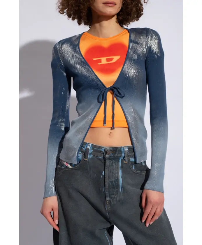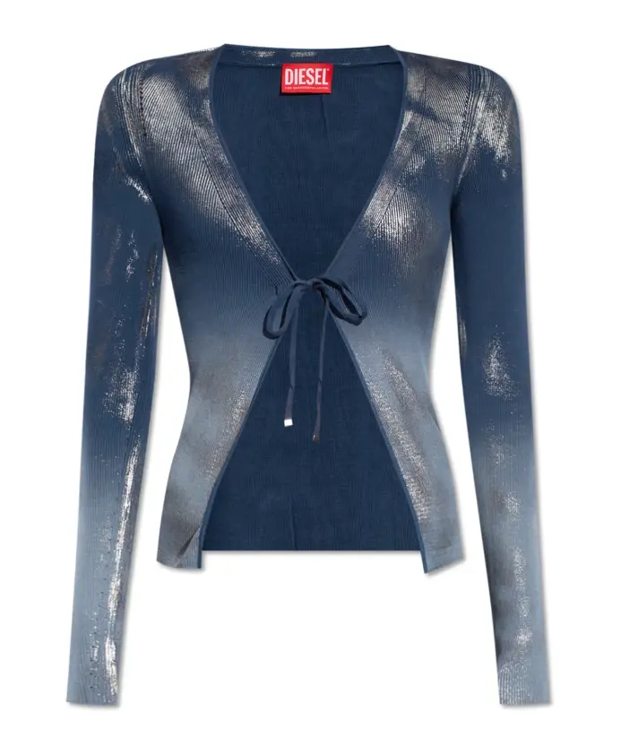 Темно-синий кардиган M-ISOLDE от Diesel. Застегивается на завязки, украшен блестками, имеет логотип, длинные рукава и эффект потертости. Параметры модели: Рост: 176 см, Обхват груди: 85 см, Обхват талии: 60 см, Обхват бедер: 89 см. Модель носит размер: XS
