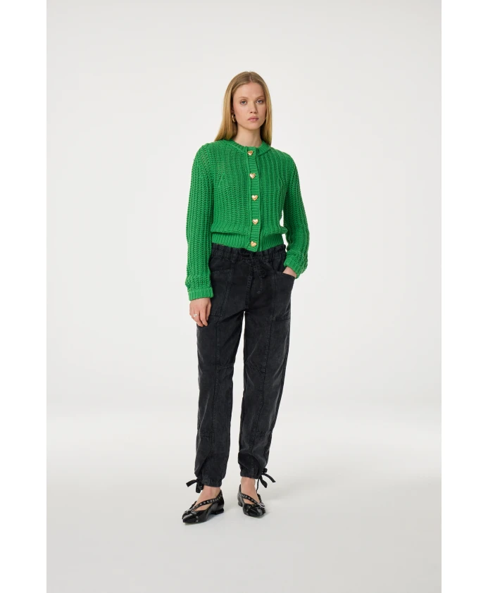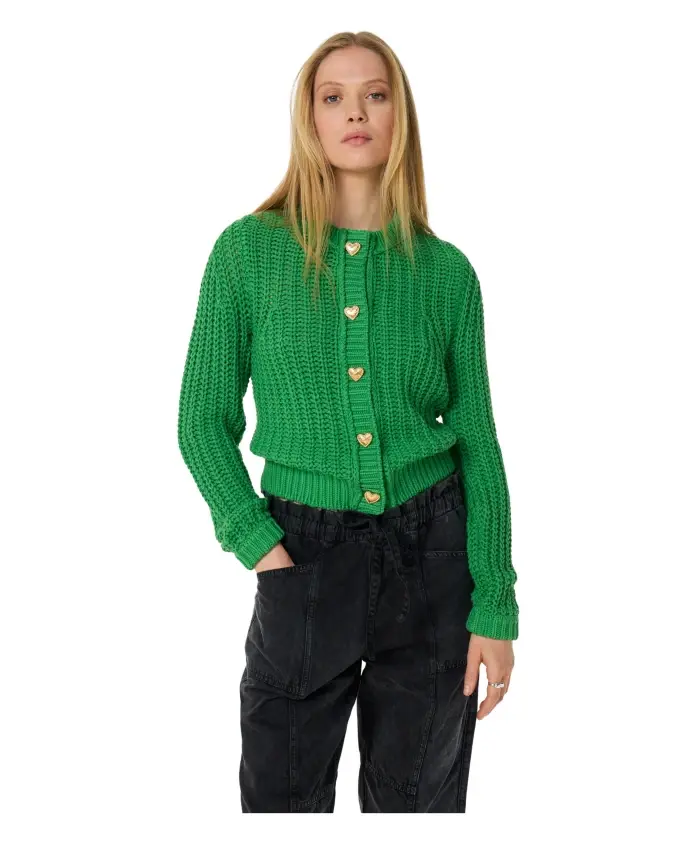 Этот ярко-зеленый кардиган украшен игривой планкой с маленькими пуговицами в форме сердечек. Комфортная смесь материалов обеспечивает высокий уровень удобства, а яркий цвет добавляет свежести и жизнерадостности любому образу.