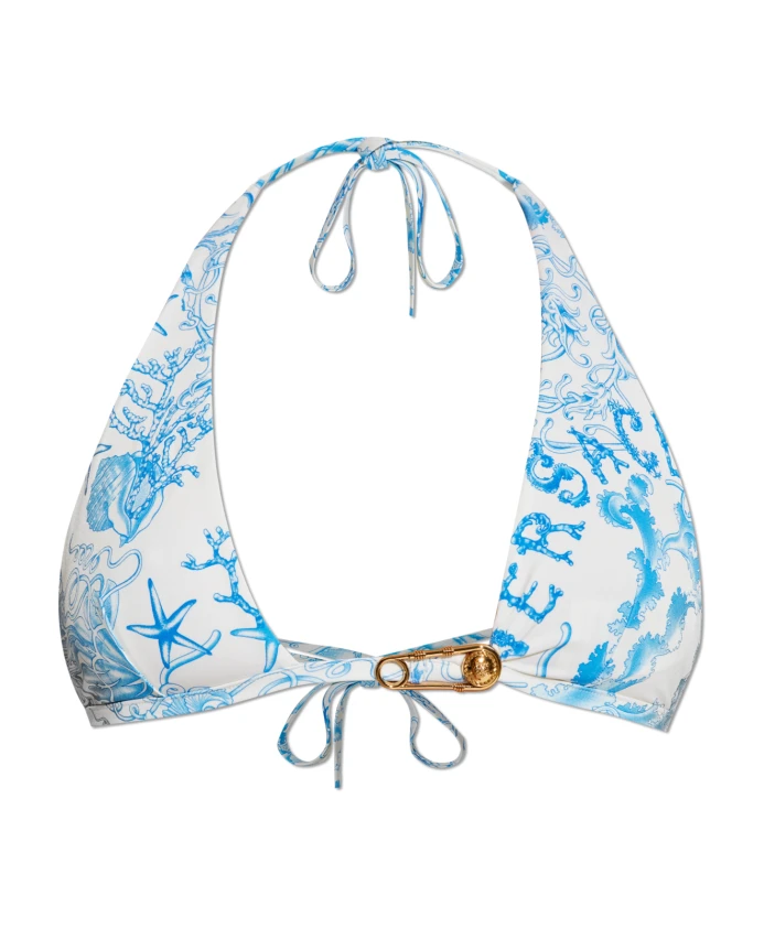 Верхняя часть бикини Versace - это синтез итальянского дизайнерского мастерства и последних тенденций. Эта модель излучает изысканность благодаря классическому треугольному силуэту с завязками на шее и спине, обеспечивающим идеальную посадку. Уникальный принт в синих оттенках на белоснежном фоне изображает морских звезд и кораллы, отсылая к захватывающему миру морской флоры и фауны. Гладкая, слегка мерцающая ткань обеспечивает исключительный комфорт, легкость и идеальную посадку. Яркой деталью является золотая булавка с тисненым символом Медузы - визитной карточкой Дома Versace. Изделие завершает изящная надпись, составленная из букв, образующих логотип дизайнера, ненавязчиво интегрированная в вневременную эстетику бренда. ПОЧЕМУ СТОИТ КУПИТЬ ЭТОТ ТОВАР? * Уникальная морская эстетика, которая дополнит любой праздничный наряд * Тщательная работа и эксклюзивные детали * Комфорт в ношении благодаря тщательно отобранным материалам * Символ престижа модного дома Versace * Вневременной дизайн и удобство в использовании Параметры модели Рост: 177 см Обхват груди: 83 см Обхват талии: 61 см Обхват бедер: 89 см Модель носит размер: 2