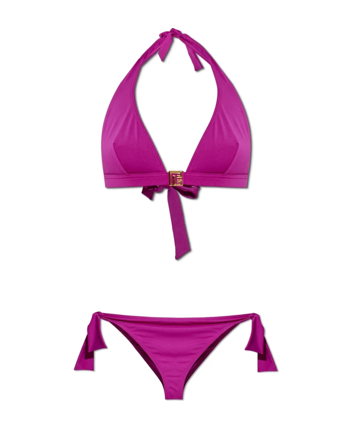 Представляем вашему вниманию купальник-бикини от одного из самых престижных модных домов - Balmain. Преобладающий розовый цвет придает ему неповторимую свежесть и подчеркивает эстетические качества дизайна. Купальник состоит из бикини-топа с треугольными чашечками, идеально подчеркивающими силуэт. Застежки на шее и спине, в сочетании с декоративной золотистой застежкой по центру, добавляют нотку утонченной элегантности. Плавки имеют классический крой с декоративными широкими боковыми бретелями, которые можно регулировать для идеальной посадки. Материал купальника подобран с особой тщательностью - эластичный и комфортный, он идеально соответствует стандартам роскошной пляжной одежды. ПОЧЕМУ СТОИТ КУПИТЬ ЭТОТ ИЗДЕЛИЕ? * Элегантный дизайн с исторической отсылкой к наследию Balmain. * Регулируемые элементы для идеальной посадки. * Декоративная золотистая застежка - уникальная дизайнерская деталь. * Высококачественные материалы, обеспечивающие долговечность и комфорт. Параметры модели: Рост: 176 см, Обхват груди: 85 см, Обхват талии: 60 см, Обхват бедер: 89 см. Модель носит размер: 40.