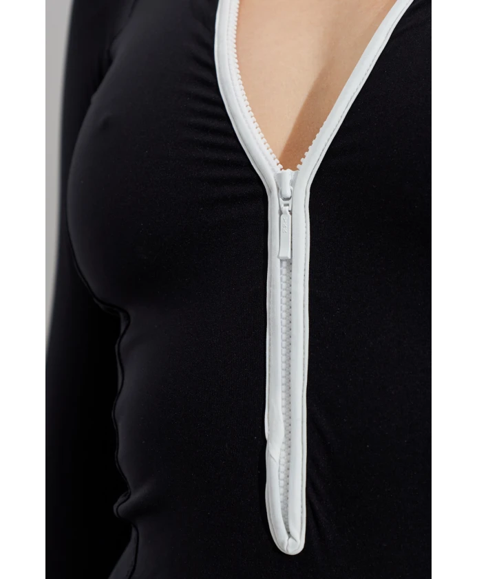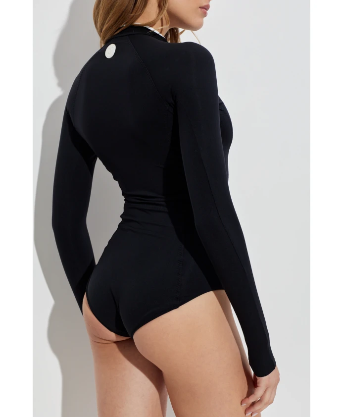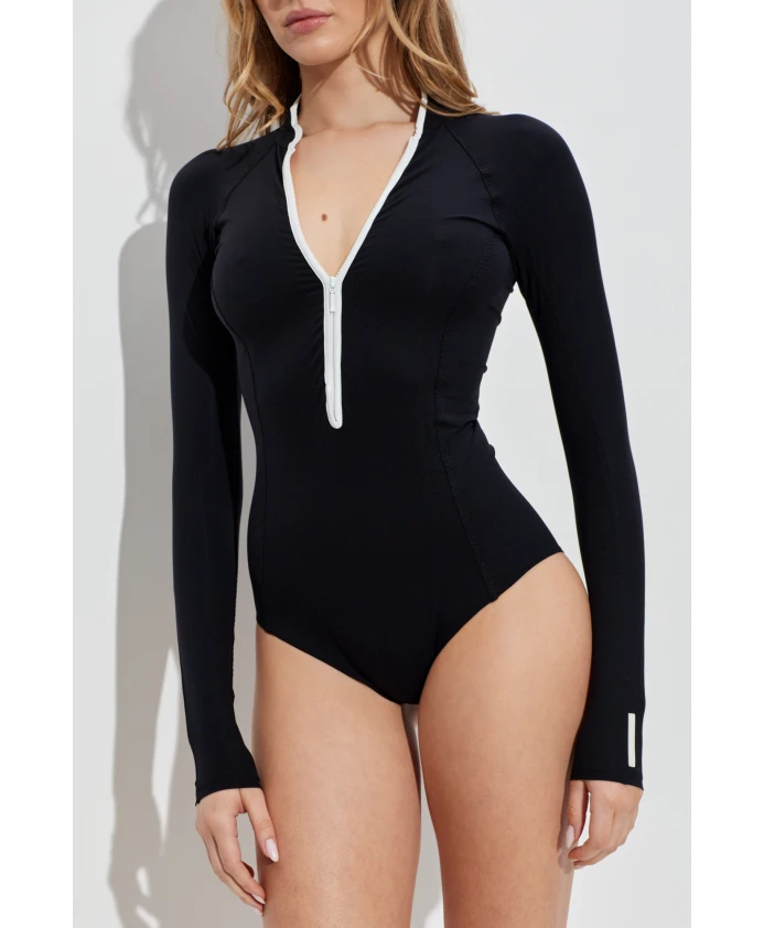 Купальник Tyra от Hunza G сочетает в себе защиту от солнца UPF 50+ и облегающий крой с длинными рукавами для надежной защиты и активного отдыха на пляже. Передняя молния и контрастные детали позволяют регулировать степень закрытости и создают минималистичный спортивный образ. Ключевые особенности: Черный | Полиамид | Защита от солнца UPF 50+ | Эластичная ткань | Сохраняет форму | Передняя молния | Длинные рукава | Отверстия для больших пальцев | Высокий вырез | Контрастная белая молния | Контрастная окантовка | Облегающий крой | Резиновый логотип на спине | Размеры и посадка: Рост: 177 см | Обхват груди: 83 см | Обхват талии: 61 см | Обхват бедер: 89 см | Модель носит размер: S | Соответствует размеру | Облегающий силуэт | Средняя посадка | Состав и уход: 74% полиамид | 26% эластан | Ручная стирка; сушить в горизонтальном положении; избегать контакта с солнцезащитным кремом, маслами и хлором.