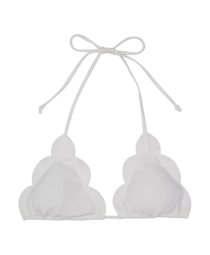 Верхняя часть бикини Marysia Swim белого цвета с треугольным вырезом и декоративными краями, вырезанными лазером. Имеет классические завязки на шее и спине, изготовлена из быстросохнущей эластичной ткани. Обеспечивает минимальное покрытие и поддержку, идеально подходит для женщин с небольшим размером груди.
