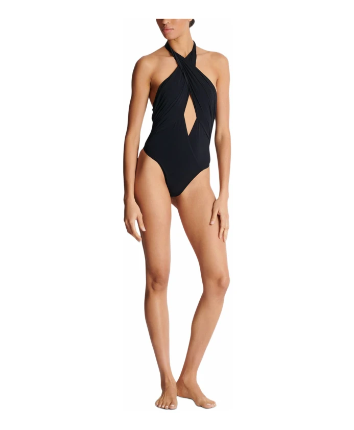 Однотонный купальник. Перекрещивающиеся бретели спереди, завязанные узлом у шеи. Боковые складки. Открытая спинка. Металлическая нашивка PB на спине. Подкладка. Рост модели 179 см, размер 36. Основной материал: 85% полиамид, 15% эластан. Сделано в Италии. Артикул: BKBKE2440