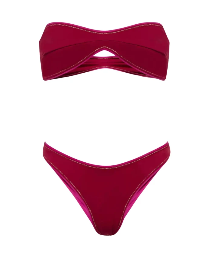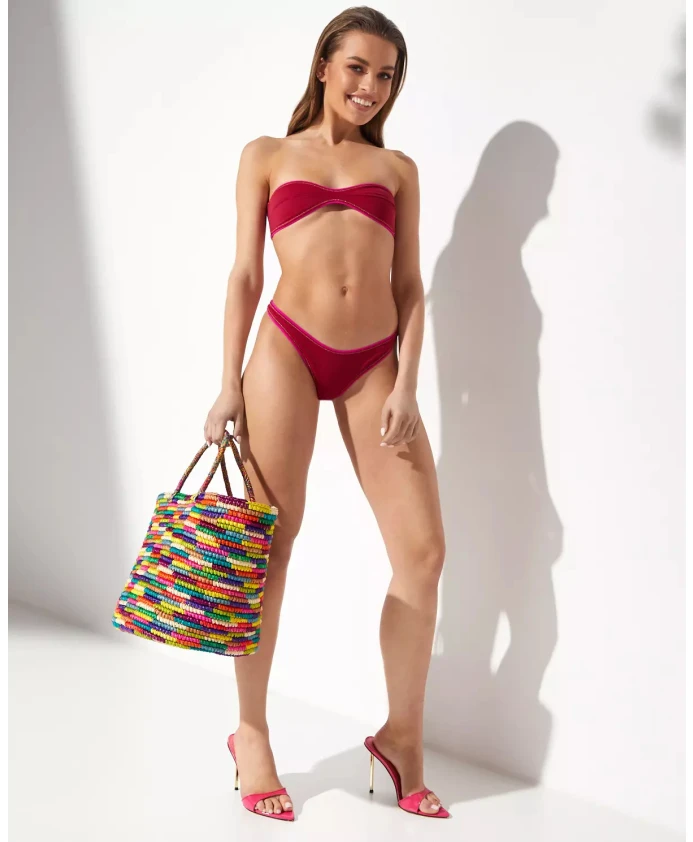 Комплект женского бикини Reina Olga бордового цвета, вдохновленный стилем 70-х. Изготовлено в Италии из эластичного материала, дизайн без бретелей с мягкими чашечками, застежка на крючки сзади, отделка контрастной блестящей каймой. Состав: 78% полиамид, 22% эластан.