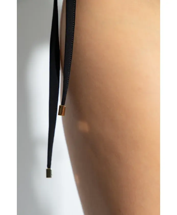Черные плавки от бикини Dolce & Gabbana. Украшены логотипом, шнуровка с металлическими элементами, выгравированными на них. Параметры модели: рост: 177 см, обхват груди: 83 см, обхват талии: 61 см, обхват бедер: 89 см. Модель носит размер 1.