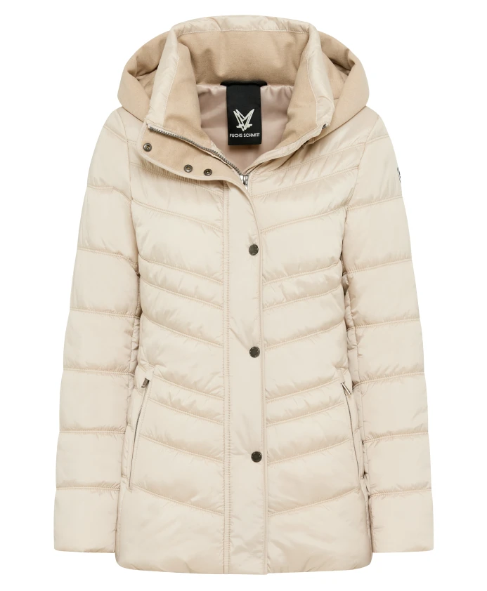 Стеганая зимняя куртка FUCHS SCHMITT Pilsen с утеплителем из термофлиса обеспечивает надежную защиту от непогоды и легкое тепло для повседневного использования в холодную погоду. Ключевые особенности: Бежевый | Светло-коричневый | Полиэстер | Защита от непогоды | Теплоизоляция (утеплитель из термофлиса) | Съемный капюшон | Внешние карманы на молнии | Скрытая передняя молния с планкой на пуговицах | Внутренний карман | Диагональная стежка | Воротник-стойка с флисовой/фланелевой подкладкой | Слегка приталенный силуэт | Размеры и посадка: Длина (размер 36): 70,0 см | Слегка приталенный крой | Состав материала и уход: Внешняя ткань: 100% полиэстер | Подкладка: 100% полиэстер | Наполнитель: 100% полиэстер. Машинная стирка при 30°C в деликатном режиме/шерстяном режиме; не отбеливать; не сушить в сушильной машине; не гладить; возможна профессиональная химчистка (перхлорэтилен).