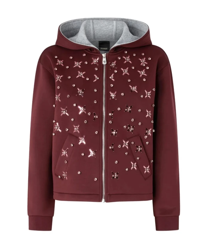 Куртка PINKO Arama сочетает в себе техническую ткань, имитирующую неопрен, с декоративными аппликациями из кристаллов и пайеток, создавая фактурный и выразительный внешний слой. Это куртка на молнии с капюшоном, сочетающая спортивный крой с декоративными деталями. Ключевые особенности: бордовый цвет | техническая ткань, имитирующая неопрен | эластичная техническая ткань | фактурный эффект неопрена | капюшон | застежка на молнию | боковые карманы | воротник с капюшоном | декорированная передняя часть с аппликациями из кристаллов и пайеток | аппликации в форме звезд | длинные рукава
