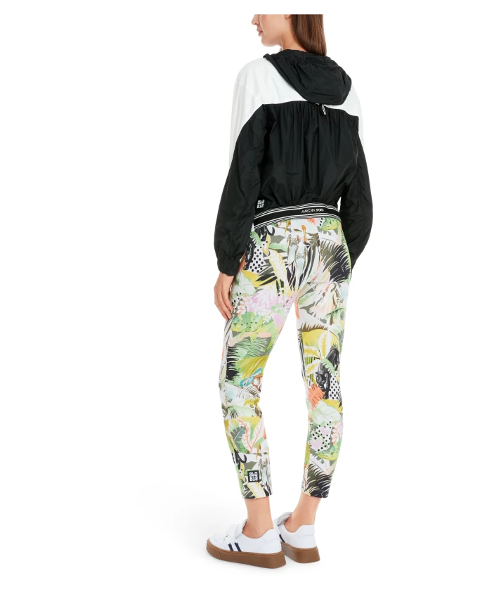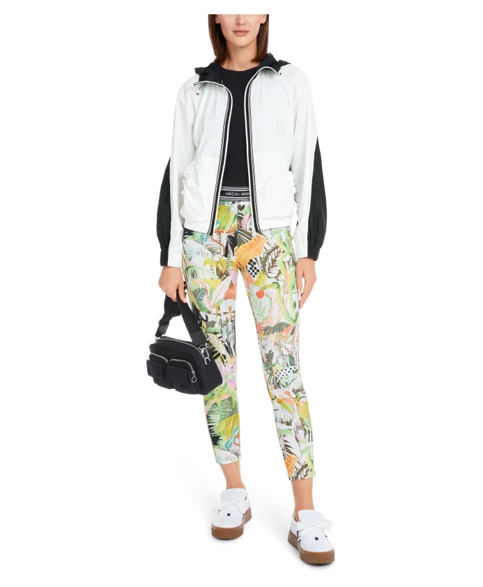 Спортивная куртка с капюшоном и застежкой-молнией. Изготовлена из легкой, эластичной ткани. Модель имеет умеренно свободный крой и спортивный стиль. Контрастные детали включают оборки по краям карманов и присборенную спинку. Нижний край спинки затянут эластичной лентой. Стильная цветовая гамма: передняя часть белая, а капюшон, некоторые части спины и рукава - черные. Ткань изготовлена из переработанного полиамида. Умеренно свободный крой. Модель в стиле блузона. Двусторонняя молния. Эластичные манжеты. Рост модели 179 см, размер N3/38.