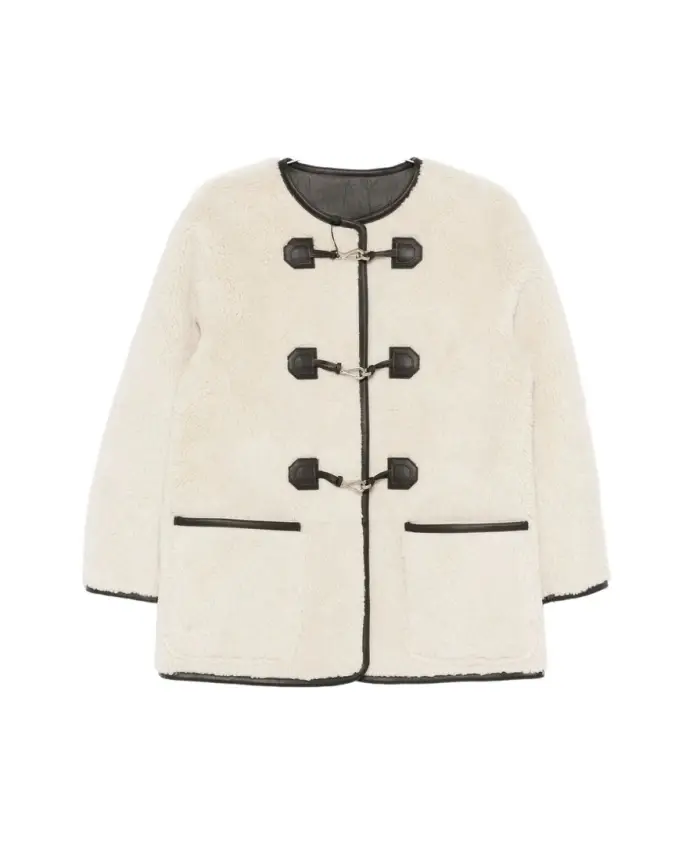 Куртка Dunst Buckled Shearling Jacket - это легкая, структурированная куртка из овчины с застежками на пряжках и пуговицах для создания современного многослойного образа. Она разработана для переходной погоды и элегантных повседневных нарядов. Ключевые особенности: Кремовый | Белый | Полиуретан | Подкладка | Не тянется | Застежка на пряжках и пуговицах | Накладные карманы | Воротник без воротника | Текстурированная овчина | Контрастные кожаные детали | Размер и посадка: Свободный крой | Материал и уход: 100% полиуретан