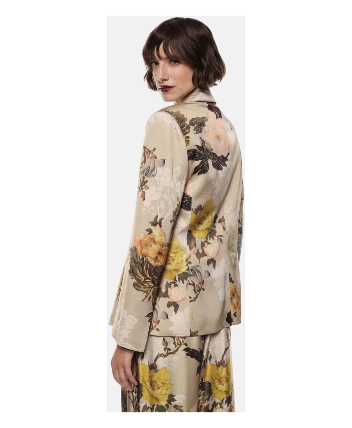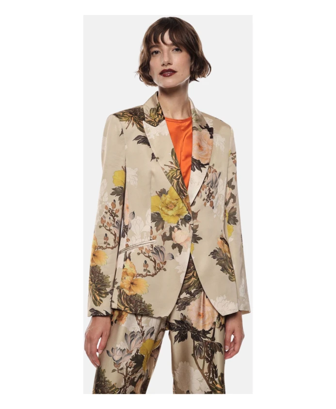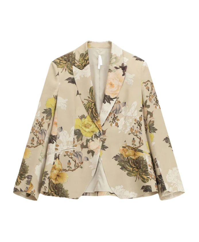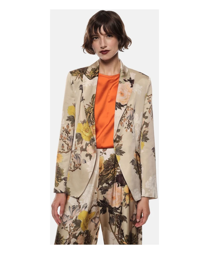 Пиджак Imperial с цветочным принтом - однобортный блейзер из вискозы с эффектным цветочным узором и заостренными лацками, идеально подходящий для элегантных и изысканных повседневных образов. Ключевые особенности: Разноцветный | Бежевый | Военный стиль | Вискоза | Однобортная застежка | Слегка присборенная спинка | Цветочный принт | Заостренные лацки | Слегка приталенный силуэт | Размеры и посадка: Слегка приталенный силуэт | Состав материала и уход: 100% вискоза