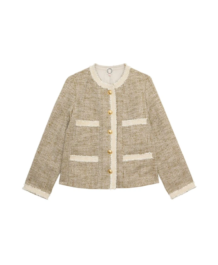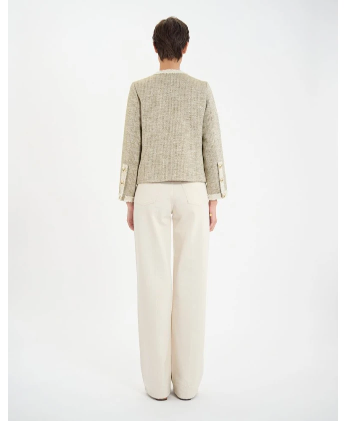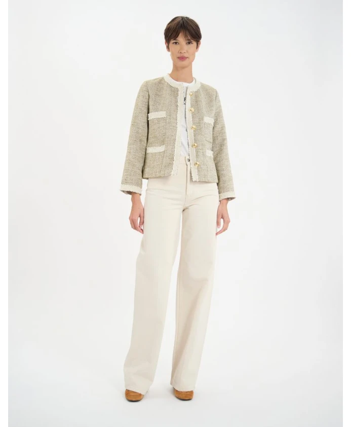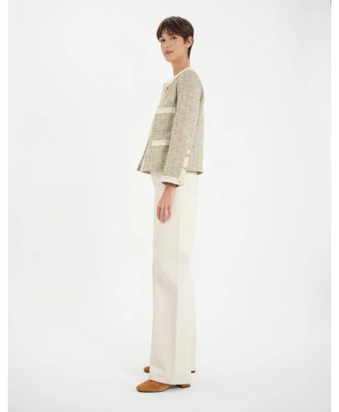 Куртка Adelaide - новый символ элегантности: плетеная отделка карманов, рукавов и выреза горловины, накладные карманы и красивая хлопковая ткань придают вашим образам модный и шикарный вид. Брюки Eduardo Darts: слегка закругленный крой, высокая талия, застежка на молнию и пуговицу спереди, итальянские карманы, задние карманы на пуговицах, шлевки для ремня. Разработано в Париже. Сделано во Франции.