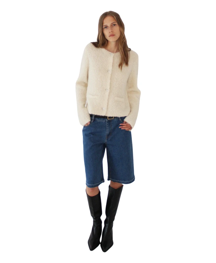 Кардиган в винтажном стиле, выполненный в виде жакета из очень мягкой и уютной букле-ткани. Этот игривый фасон легко впишется как в повседневную, так и в более праздничную обстановку. Декоративные пуговицы подчеркивают образ и добавляют нотку элегантности.