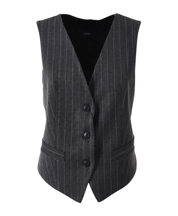 Подчеркните свой стиль с помощью этого полосатого женского жилета от Relish, застегивающегося на 3 пуговицы, с накладными карманами и заклепками. Изготовлен из 87% полиэстера, 10% вискозы и 3% эластана.