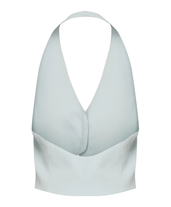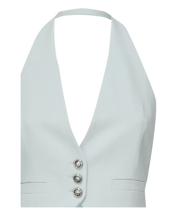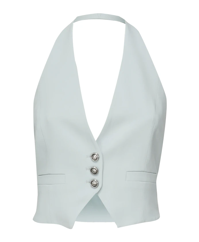 Подчеркните свой стиль с помощью этого светло-голубого жилета PINKO. Он имеет застежку на 3 пуговицы, воротник-стойку, шнуровку сзади и открытую спинку. Сделано в Италии. Размер на фото - 40 IT.