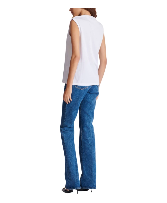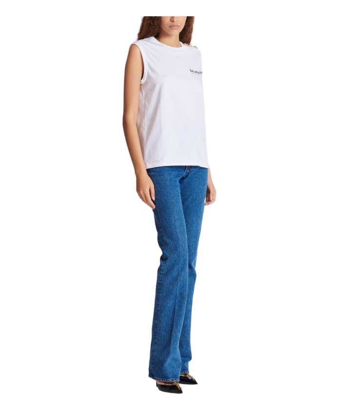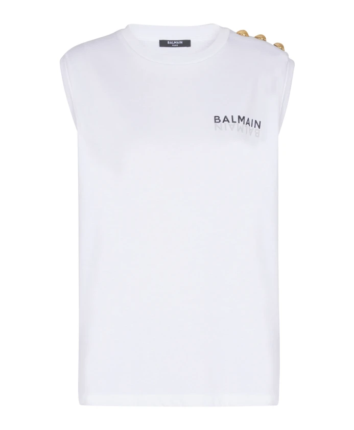 Майка Balmain Paris от Balmain - это свободная хлопковая майка, отличающаяся фирменными рельефными золотыми пуговицами на плече. Это универсальная базовая вещь для создания изысканных повседневных образов. Ключевые особенности: Белый | Хлопок | Круглый вырез с ребристой отделкой | Без рукавов | Три декоративные рельефные металлические пуговицы золотистого цвета на плече | Двойные проймы | Контрастный логотип Balmain на передней части | Размеры и посадка: Свободный крой | Рост модели 180 см, размер S | Состав и уход: 100% хлопок
