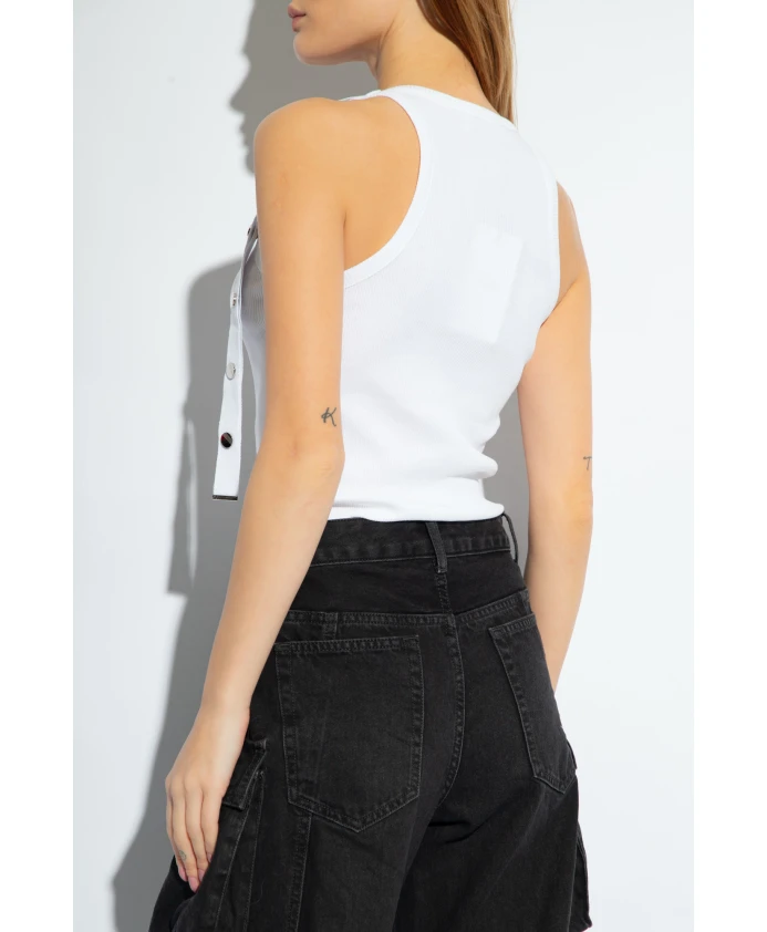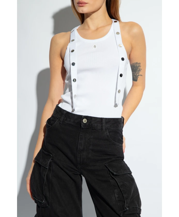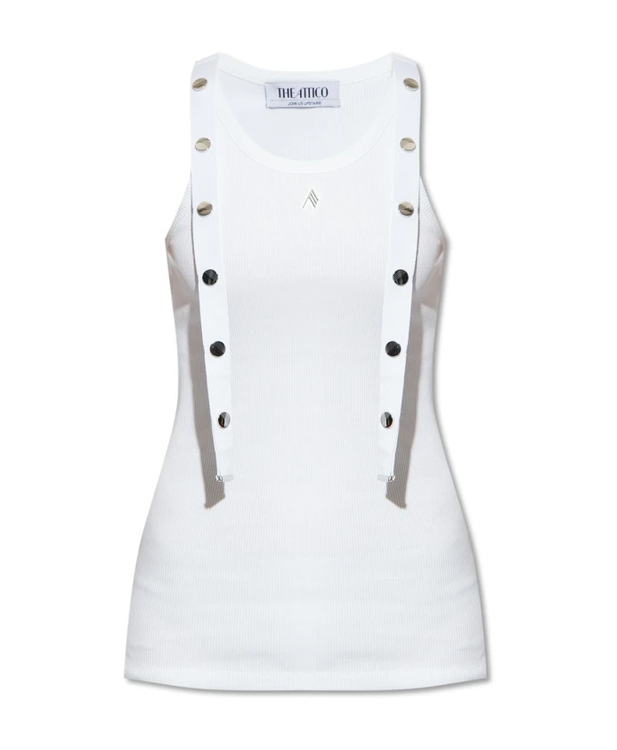 Майка Attico - это элегантная, облегающая модель из ребристого хлопка с декоративными бретелями, застегивающимися на серебристые кнопки, и нашивкой с логотипом спереди. Ключевые особенности: Белый | Хлопок | Декоративные бретели | Серебристые кнопки | Круглый вырез | Нашивка с логотипом | Крой: Облегающий силуэт | Состав и уход: 100% хлопок | Машинная стирка в холодной воде, сушка в сушилке при низкой температуре.