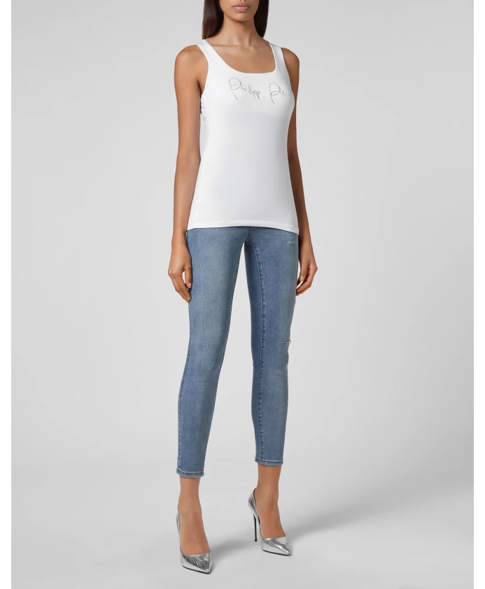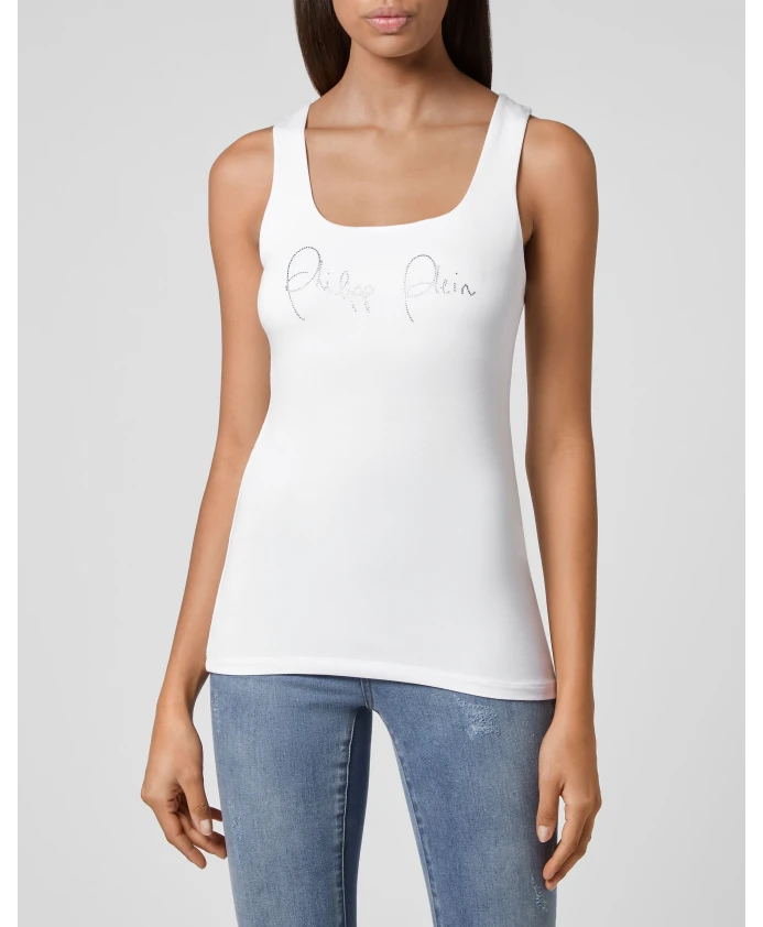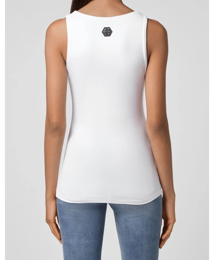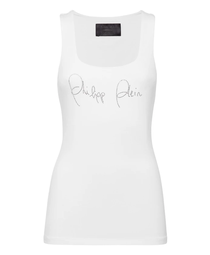 Майка Philipp Plein - хлопковый трикотаж без рукавов, украшенный стразами и шестиугольной нашивкой из сафьяновой кожи на кокетке. Ключевые особенности: Белый | Кристаллы | Хлопковый трикотаж | Без рукавов | Фирменная деталь Plein со стразами | Шестиугольная нашивка из сафьяновой кожи на кокетке | Двойная строчка по низу | Состав и уход: Хлопок | Сафьяновая кожа | Стразы