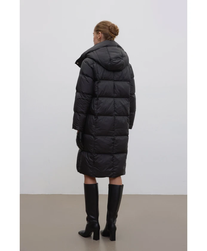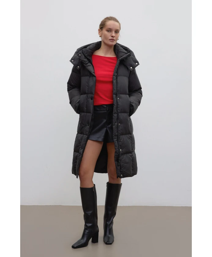 Estro представляет зимнее пуховое пальто длиной до колена - пальто, разработанное для холодной погоды, с наполнителем из гусиного пуха 90/10, обеспечивающим высокую теплоизоляцию без лишнего объема. Практичные детали, такие как воротник-стойка с фиксатором, плавно застегивающаяся молния и прикрепленный капюшон, делают его надежным повседневным зимним элементом гардероба. Ключевые особенности: Черный | Полиэстер | Высококачественный утеплитель (гусиный пух) | Легкая теплоизоляция | Прикрепленный капюшон | Передняя молния с кнопками | Практичные карманы | Плавно застегивающаяся молния | Высокий воротник | Воротник-стойка с фиксатором | Минималистичный силуэт | Длинные рукава | Длина до колена | Размеры и посадка: Размер S - Длина (спереди): 100 см | Длина рукава: 56 см | Грудь: 54 см | Плечи: 45 см | Талия: 54,5 см | Ширина рукава: 19,5 см | Высота воротника: 12 см | Ширина (снизу): 58 см | Размер M - Длина (спереди): 100 см | Длина рукава: 56,5 см | Грудь: 54 см | Плечи: 44 см | Талия: 54,5 см | Ширина рукава: 19,5 см | Высота воротника: 12 см | Ширина (снизу): 58 см | Размер L - Длина (спереди): 100 см | Длина рукава: 58 см | Грудь: 55,5 см | Плечи: 45 см | Талия: 57 см | Ширина рукава: 20,5 см | Высота воротника: 12 см | Ширина (снизу): 62,5 см | Свободный крой | Рост модели 172 см, параметры 82/63,5/90, размер S | Состав и уход: Верхняя ткань: 100% полиэстер | Подкладка: полиэстер | Наполнитель: 90% гусиный пух, 10% перья