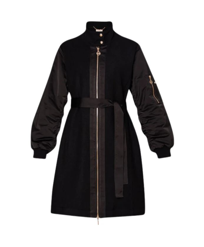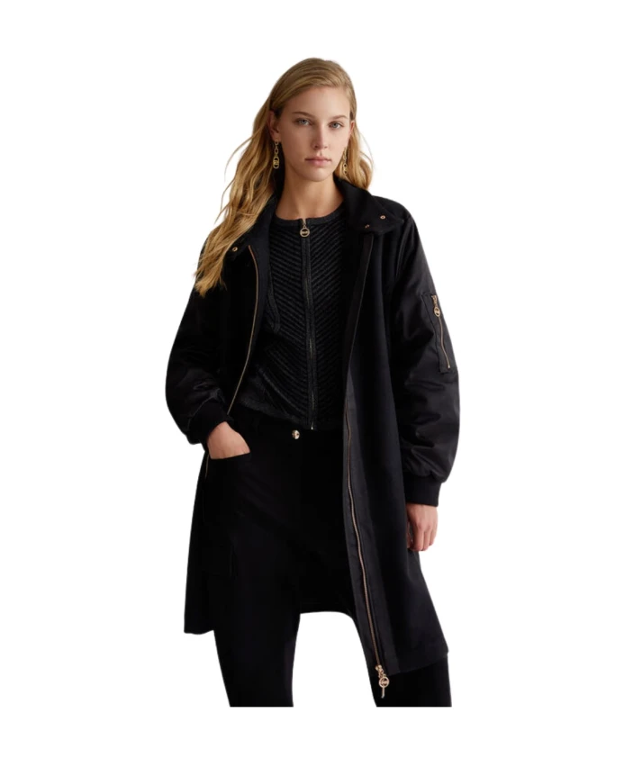Оставайтесь в тепле и выглядите стильно в этой женской парке Liu Jo. Изготовленная из смесовой шерстяной ткани, она имеет высокий воротник на кнопках, застежку-молнию с двумя бегунками, карман на молнии на рукаве, пояс в тон, металлический логотип на рукаве, фирменный язычок молнии, нейлоновые детали, стандартный крой и представлена в классическом черном цвете.