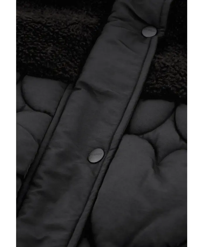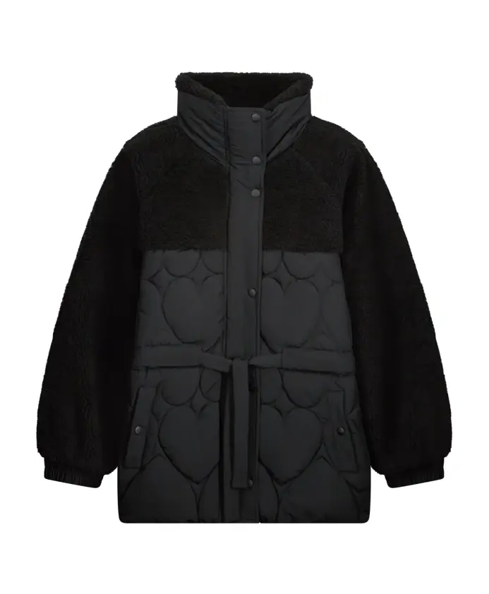Эта черная стеганая куртка имеет высокий воротник, застежку на пуговицы спереди и регулируемый шнурок на талии для создания привлекательного силуэта. Мягкая ткань «тедди» подчеркивает плечи, грудь и рукава, а спереди и сзади украшена стеганым узором в виде сердечек. Теплая и стильная куртка с уникальной текстурой, идеально подходящая для холодных дней.