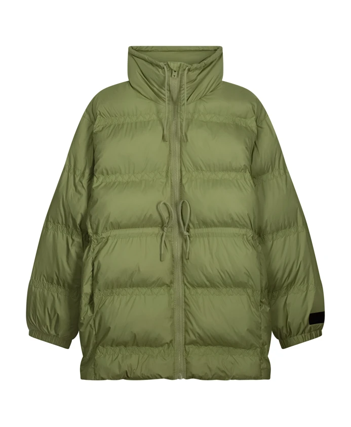 Эта стеганая куртка оливково-зеленого цвета имеет длину чуть ниже бедер для дополнительного тепла. Она оснащена высоким воротником-стойкой на молнии, двумя боковыми карманами и регулируемым шнурком для подчеркивания талии. Функциональная и хорошо сидящая одежда, разработанная для холодной погоды.