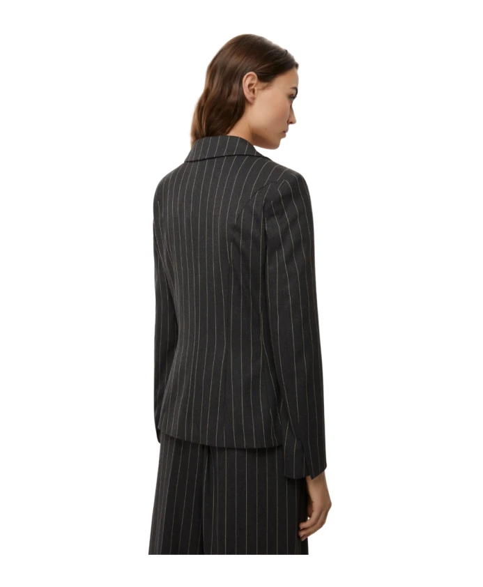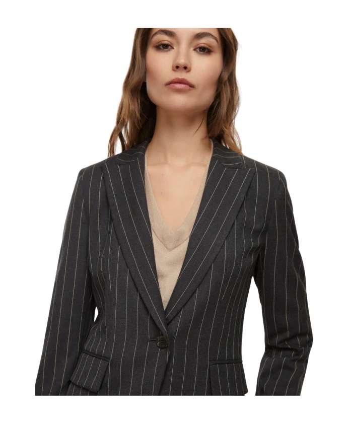 Блейзер Marella Farnese сочетает в себе слегка приталенный силуэт и эластичную вискозную ткань, создавая элегантные офисные и повседневные образы. Дизайн в тонкую полоску и застежка на одну пуговицу делают его идеальным выбором для изысканного повседневного стиля. Основные характеристики: Черный | Темно-серая тонкая полоска | Вискоза | Эластичная ткань | Застежка на одну пуговицу спереди | Прорезные карманы с клапанами | Полностью на подкладке | Лацканы с вырезом | Тонкая полоска | Ткань с диагональной текстурой | Размеры и посадка: Слегка приталенный | Состав ткани и уход: Основной материал: 69% полиэстер, 29% вискоза, 2% эластан | Подкладка: 97% полиэстер, 3% эластан | Не стирать в воде; не отбеливать; не сушить в сушильной машине. Гладить при низкой температуре (макс. 120°C); химчистка с перхлорэтиленом (щадящий режим); не подвергать профессиональной влажной чистке.