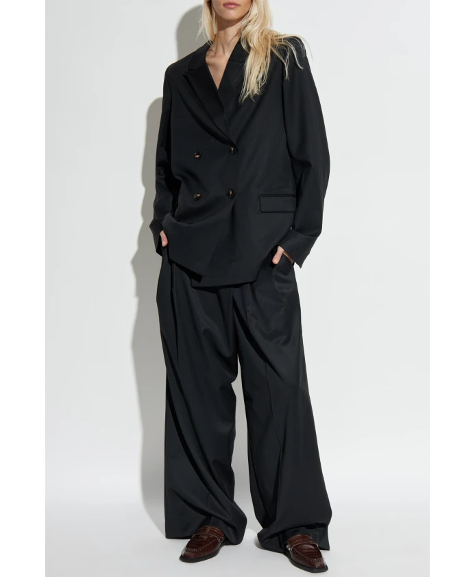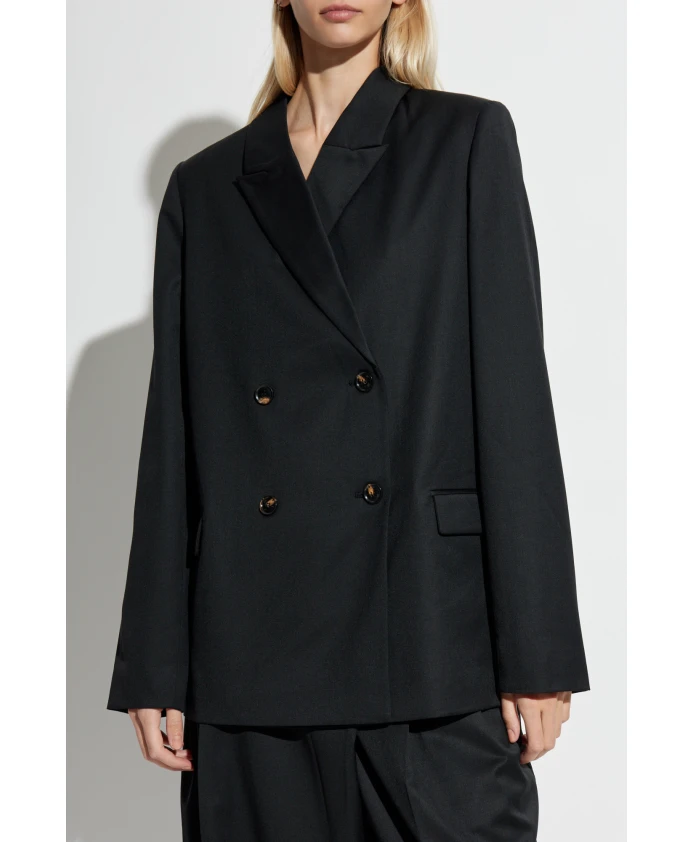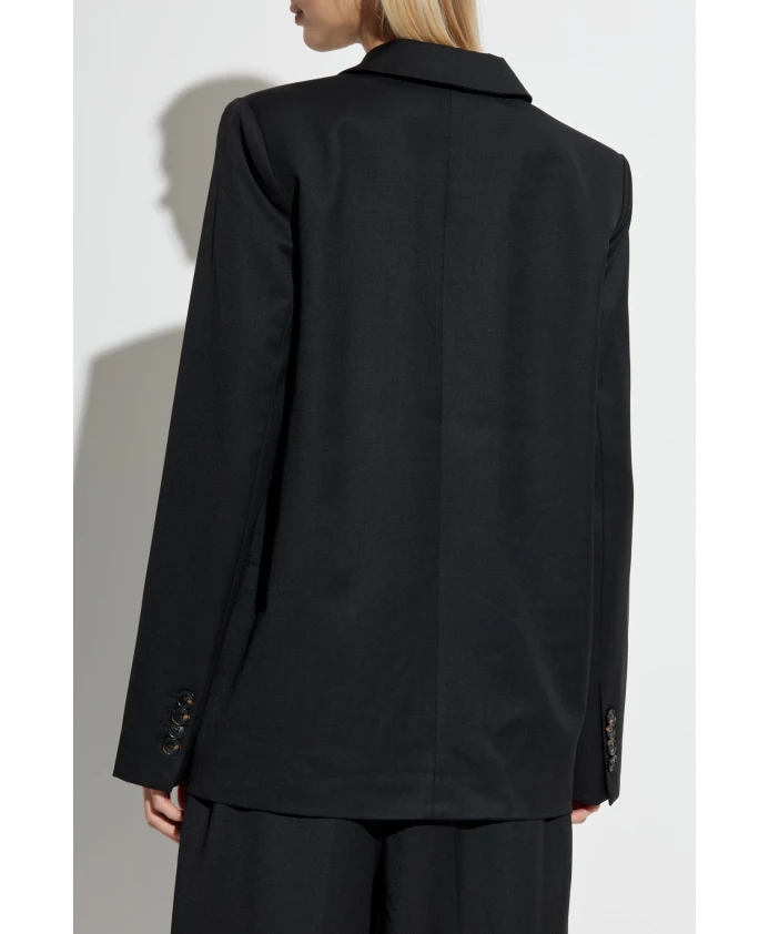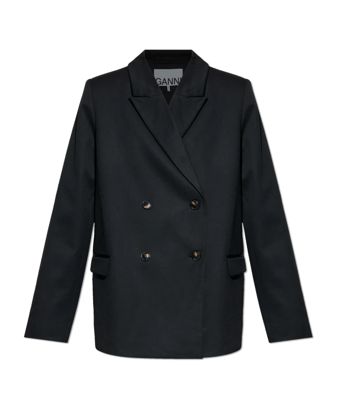 Двубортный блейзер Ganni - это обновленная версия классического приталенного жакета, отличающаяся свободным, слегка увеличенным силуэтом и изысканными деталями. Он идеально подходит для элегантных повседневных образов и стильного офисного стиля. Ключевые особенности: Черный | Смесь шерсти и полиэстера | Слегка эластичный | Двубортная застежка на пуговицы | Два накладных передних кармана | Двусторонняя подкладка из ацетата и вискозы | Лацканы с вырезом | Прямая линия плеч | Темные пуговицы с декоративной отделкой | Двойная застежка на пуговицы спереди | Размеры и посадка: Свободный, слегка увеличенный крой | Состав и уход: 54% полиэстер, 44% шерсть, 2% эластан | Подкладка из ацетата и вискозы | Только химчистка. Не стирать. Не отбеливать. Не сушить в сушильной машине. Гладить при средней температуре. Не гладить отделку.