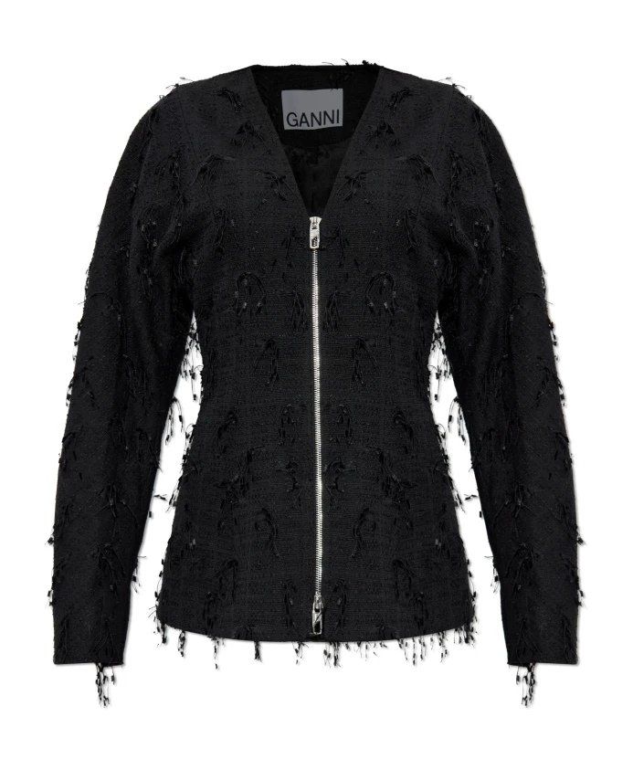 Твидовый блейзер с бахромой Ganni, черный