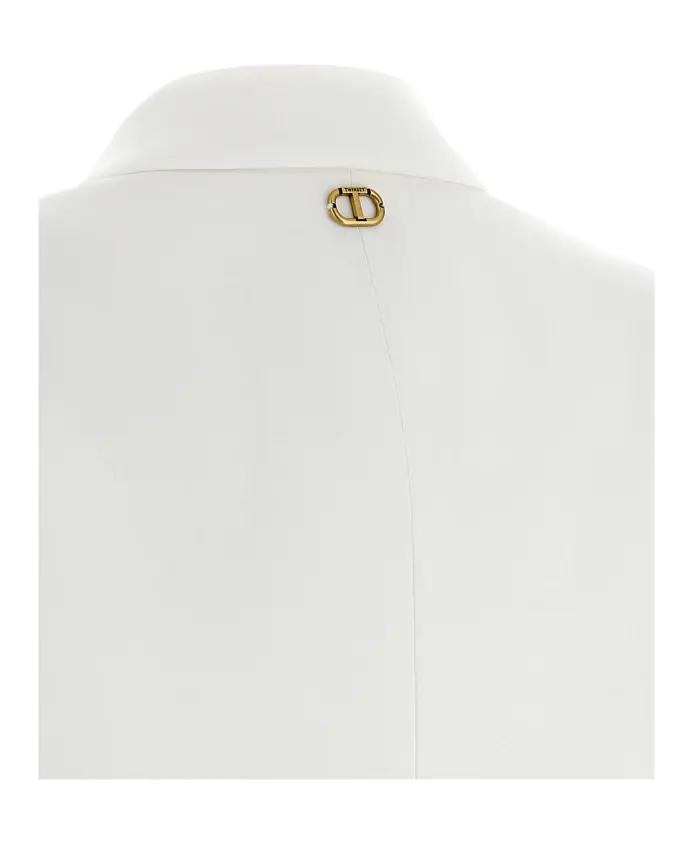 Блейзер Twinset с рукавами-кейпами сочетает в себе приталенный однобортный силуэт и эффектные рукава-кейпы, создавая элегантный и стильный образ. Основные характеристики: Белый | Креп | Застежка на крючок спереди | Накладные карманы | Однобортный | Зеркальные лацканы | Широкие открытые рукава с эффектом кейпа | Металлическая овальная Т-образная нашивка на спине | Состав и уход: 70% ацетат | 30% полиэстер