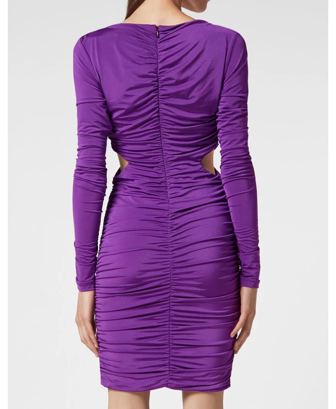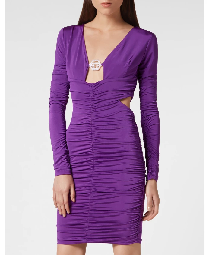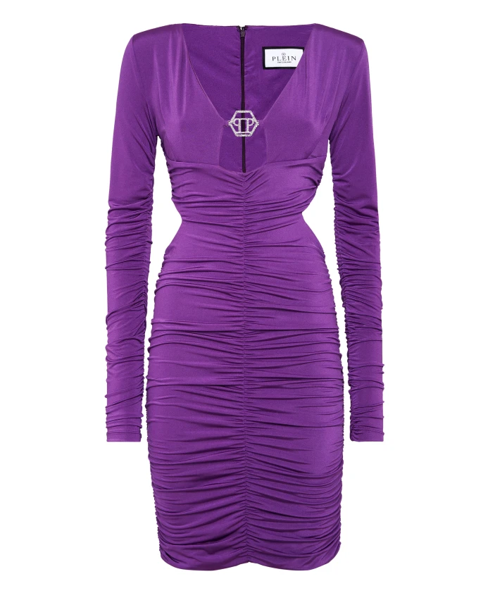 Платье-комбинация Philipp Plein из эластичной лайкры с глянцевым покрытием для эффектного вечернего образа. Глубокий вырез с фирменным шестиугольным узором и драпировкой идеально подходит для особых случаев. Ключевые особенности: Фиолетовый | Лайкра | Эластичная ткань | Глянцевая отделка | Потайная застежка-молния по центру спины | Глубокий вырез | Шестиугольная отделка | Драпированные длинные рукава | Асимметричные вырезы | Драпированный силуэт