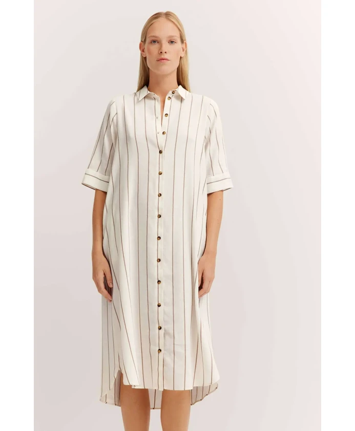 Платье-рубашка свободного кроя в полоску от Bugatti - это легкая вещь из смеси льна и вискозы, созданная для жарких летних дней и пляжного отдыха. Оно имеет застежку на пуговицах, рукава до локтя и закругленные боковые разрезы для свободы движений. Ключевые особенности: Многоцветное | Белый | Бежевый | Коричневый | Лен и вискоза | Дышащая ткань | Легкая | Застежка на пуговицы | Рукава до локтя | Боковые разрезы | Воротник-рубашка | Вертикальная полосатая расцветка | Закругленный низ | Размеры и посадка: Свободный крой | Состав и уход: Лен | Вискоза