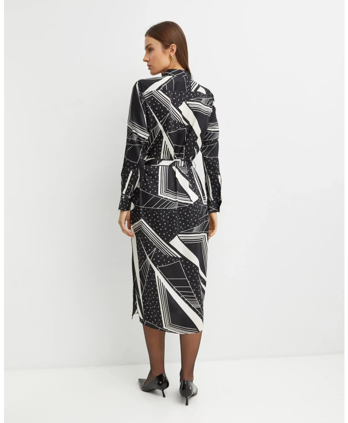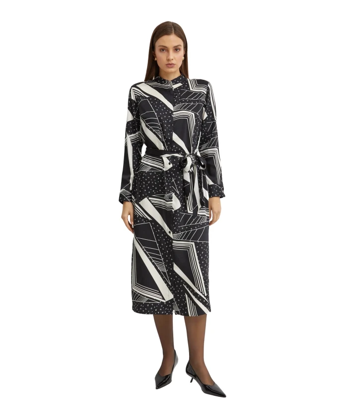 Платье Lauren от Ralph Lauren в черно-белом цвете, украшенное геометрическим узором, длиной миди, с заостренным воротником на пуговицах, длинными рукавами с манжетами на пуговицах, талия подчеркнута поясом.