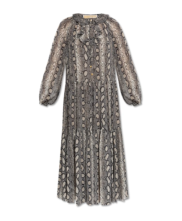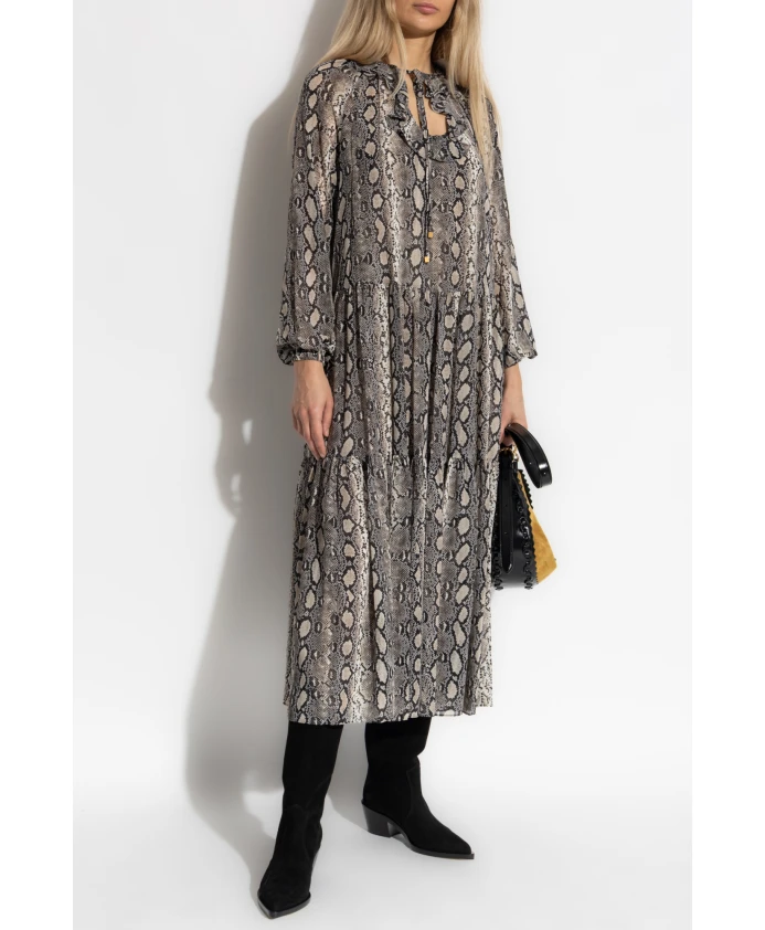 Это свободное платье от известного дизайнера Майкла Майкла Корса - воплощение изысканности и вневременной элегантности. Представленное в оттенках серого, черного и бежевого, оно украшено смелым узором, вдохновленным змеиной кожей, что придает изделию роскошный характер. Многослойная юбка с мягкими складками и едва заметный разрез на декольте придают платью легкость и невероятную непринужденность. Нежная, полупрозрачная ткань - искусно выполненное сочетание шифона и полиэстера - мягко обволакивает силуэт, словно туман, обеспечивая комфорт и исключительный внешний вид. Свободная длина миди идеально дополняет утонченный дизайн и подчеркивает эксклюзивность изделия. ПОЧЕМУ СТОИТ КУПИТЬ ЭТОТ ТОВАР? * Уникальный узор, вдохновленный змеиной кожей, подчеркивающий индивидуальный стиль * Роскошный, воздушный и легкий материал, гарантирующий комфорт * Всемирно известный бренд, славящийся своей неизменной элегантностью * Крой, обеспечивающий свободу движений и подчеркивающий женскую фигуру * Тщательная отделка, демонстрирующая высочайший уровень мастерства. Параметры модели: Рост: 177 см, Обхват груди: 83 см, Обхват талии: 61 см, Обхват бедер: 89 см. Модель носит размер: S
