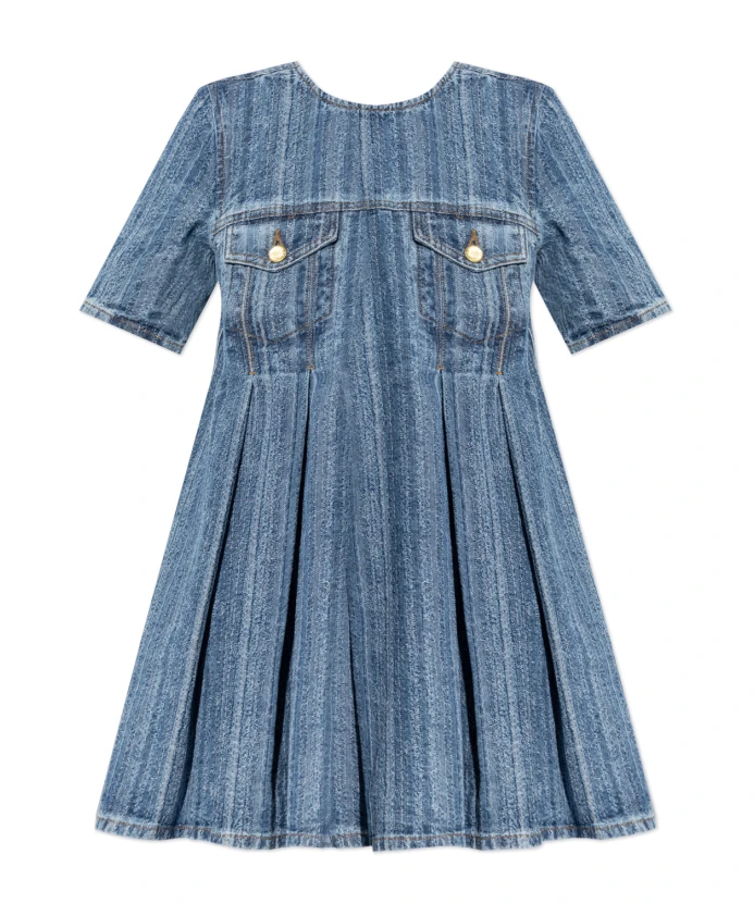 Платье-мини GANNI в полоску из джинсовой ткани с плиссировкой - это структурированное платье, сочетающее слегка расклешенный подол с глубоким вырезом на спине, создающее элегантный, но игривый образ. Широкие вытачки формируют силуэт, а короткие рукава и нагрудные карманы обеспечивают практичность как днем, так и вечером. Ключевые особенности: Цвет: средне-синий | Хлопок | Накладные нагрудные карманы с клапанами | Застежка на пуговицы золотистого цвета | Круглый вырез | Короткие рукава | Вырез на спине | Широкие вытачки для слегка расклешенного подола | Накладные нагрудные карманы с клапанами | Открытая строчка и обработанные швы | Размеры и посадка: Рост модели: 177 см | Обхват груди модели: 83 см | Обхват талии модели: 61 см | Обхват бедер модели: 89 см | Модель носит размер: 36 | Соответствует размеру | Мини-длина | Состав и уход: 100% хлопок. Машинная стирка в холодной воде. Не отбеливать. Не сушить в сушильной машине. Гладить при низкой температуре. Не подвергать химчистке. Стирать с вещами аналогичного цвета. Стирать и гладить с изнаночной стороны.