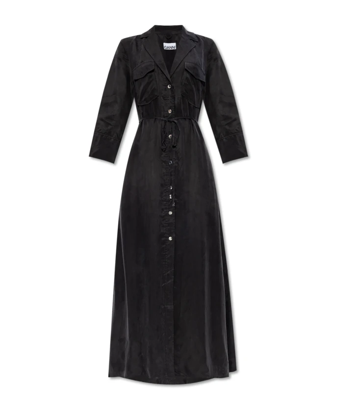 Платье-макси GANNI Fluid Cupro - это приталенное платье из смеси купро и вискозы, с отстегивающимся поясом на талии и большими нагрудными карманами с клапанами, создающее изысканный и практичный образ. Ключевые особенности: Черный | Купро | Легкий | Глянцевая отделка | Мягкая драпировка | Отстегивающийся пояс в тон | Нагрудные карманы с клапанами | Застежка на золотистые пуговицы спереди | Золотистые пуговицы на рукавах | Воротник | V-образный вырез | Длинные рукава без манжет | Слегка расклешенный низ | Приталенный силуэт макси | Золотистые пуговицы | Размеры и посадка: Приталенный крой | Длина макси | Приталенный силуэт | Состав и уход: 60% купро | 40% вискоза | Машинная стирка в холодной воде; не отбеливать; не сушить в сушильной машине; гладить при низкой температуре; не подвергать химчистке; стирать и гладить наизнанку; использовать средство для стирки шелка; деликатная ткань.