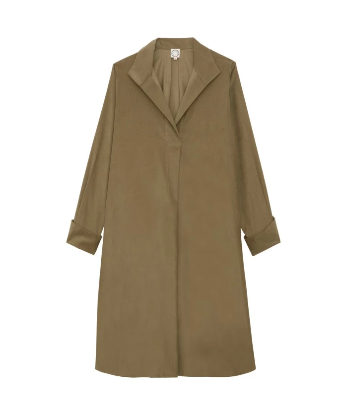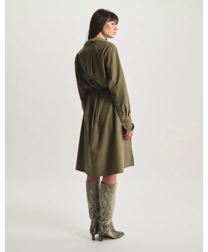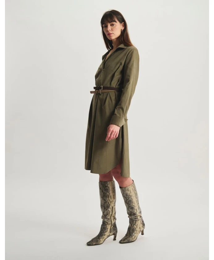Платье Noella выполнено в красивом современном оттенке хаки. Свободный, струящийся крой создает ощущение комфорта и непринужденности, которое подчеркивается такими деталями, как плоские складки спереди и сзади, а также длинные рукава со складками на манжетах, аккуратно застегивающимися на пуговицы. Воротник-жакет, отличительная черта подлинного, утонченного стиля, придает платью слегка богемный вид. Изделие с характером, идеально подходящее как для города, так и для поездки на выходные. Платье Noella: свободный крой, длина до колена, воротник-фонарик, длинные рукава, плиссированный подол с застежкой на пуговицы, манжеты с вырезом, плоские складки спереди и сзади, боковые разрезы. Разработано в Париже. Сделано в Европе.