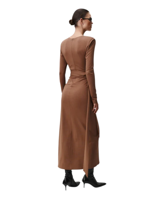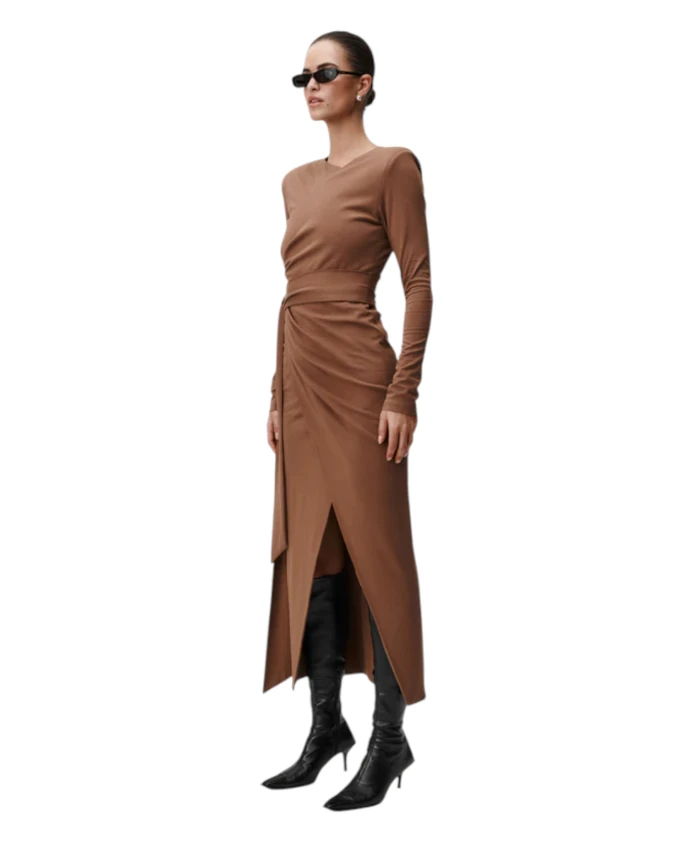 Платье Undress Code Audrey - это платье-миди с запахом, выполненное в насыщенном орехово-коричневом цвете, отличающееся плотной драпировкой и структурированным силуэтом с запахом. Оно создано для того, чтобы легко переходить от элегантных дневных образов к стильным вечерним нарядам. Ключевые особенности: Коричневый | Светло-коричневый | Вискоза | Дизайн с запахом и поясом | Длинный пояс, дважды обхватывающий талию | Асимметричный разрез спереди | Длина миди | Складки спереди | Структурированный силуэт | Размеры и посадка: Рост модели 179 см, размер S | Приталенный силуэт | Состав и уход: 61% вискоза | 32% полиамид | 7% эластан | Ручная стирка с любовью, чтобы вы могли наслаждаться своим платьем как можно дольше.