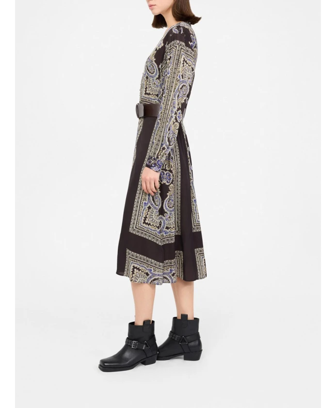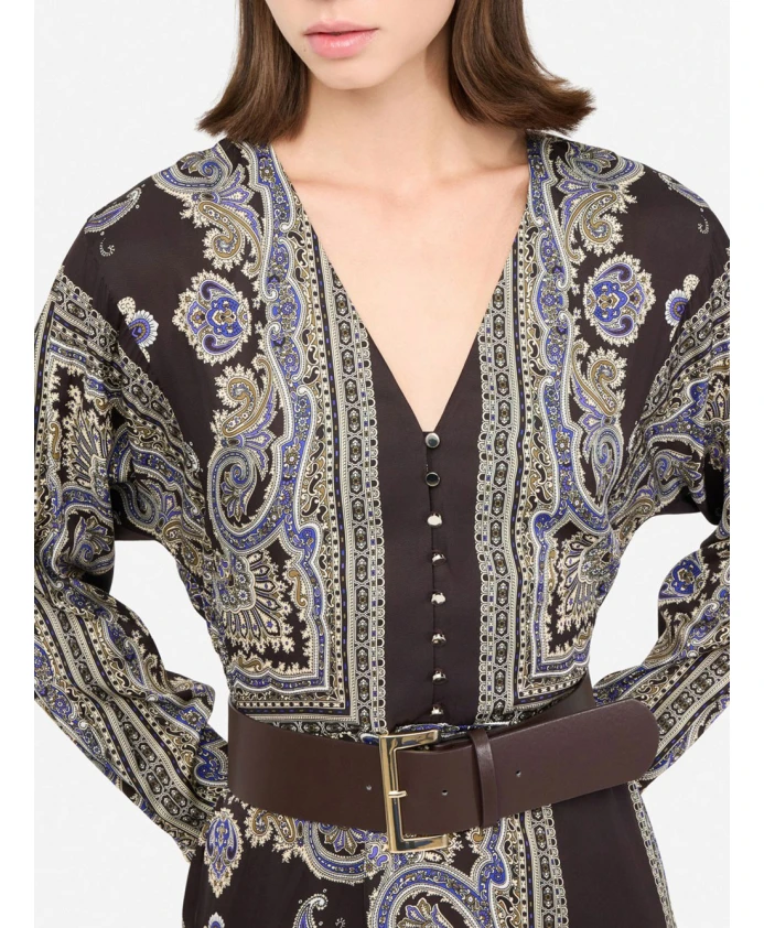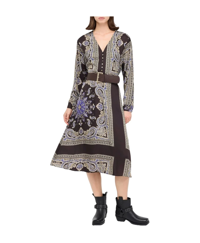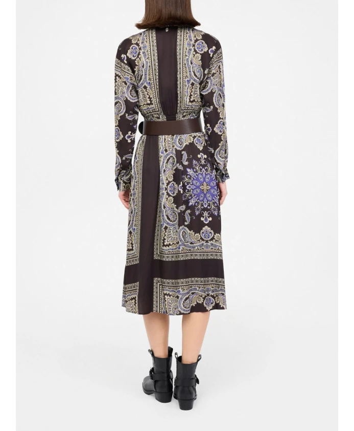 Платье Liu Jo с принтом и поясом сочетает в себе яркий сплошной принт, V-образный вырез и съемный пояс, создавая элегантный и непринужденный образ. Созданное для дневных мероприятий или вечерних выходов, оно подчеркивает струящийся силуэт и удобство в ношении. Ключевые особенности: Многоцветное | Арабская зима | Вискоза | Съемный пояс | Застежка на пуговицы спереди | Эластичная присборенная спинка | V-образный вырез | Длинные рукава | Сплошной принт | Рукава реглан | Размеры и посадка: Длина: 118 см (размер 36) | Свободный крой | Состав и уход: 100% вискоза | Не стирать в воде. Химчистка с перхлорэтиленом. Не отбеливать. Не сушить в сушильной машине. Гладить при максимальной температуре 110°C.