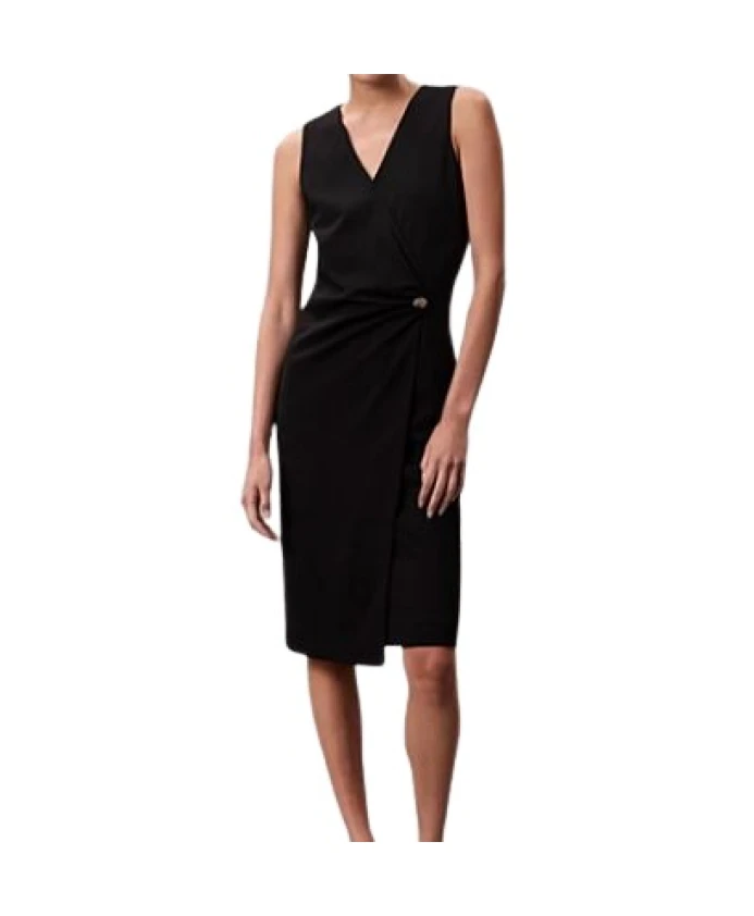 Платье без рукавов из эластичного крепа от Calvin Klein - это минималистичное короткое платье с силуэтом «запах», созданное для универсального использования как днем, так и вечером. Оно выполнено из эластичной креповой ткани и имеет потайную застежку-молнию сзади для гладкого и элегантного вида. Ключевые особенности: Черный | Эластичный креп из полиэстера | Эластичная ткань | Потайная застежка-молния сзади | Нефункциональная пуговица с логотипом Calvin Klein спереди | Полностью на подкладке | V-образный вырез | Без рукавов | Силуэт «запах» | Легкие складки | Размер и посадка: Классический крой | Состав и уход: Верх: 96% полиэстер, 4% эластан | Подкладка: 100% полиэстер | Машинная стирка