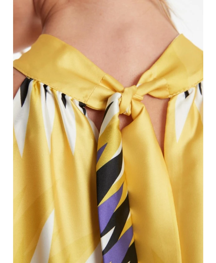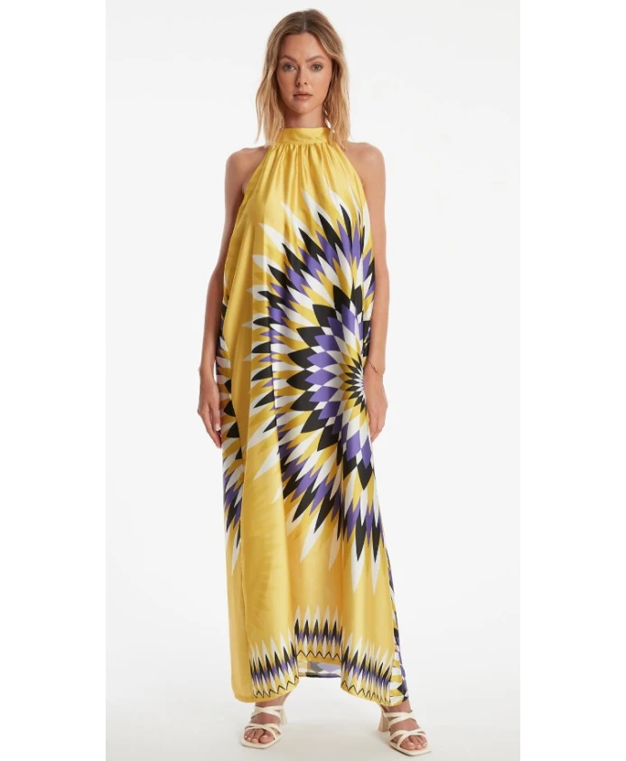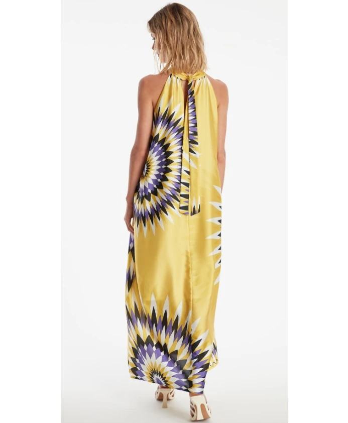 Макси-платье Zedala от Ana Alcazar - настоящая изюминка вашего образа: яркий желтый оттенок и стилизованный крупный узор из звезд фиолетового, черного и кремового цветов. А-образный силуэт и отсутствие рукавов, открытый воротничок-халтер с коротким воротником-стойкой придают платью элегантность и женственность. Изящная завязка на спине завершает дизайн. Идеальное платье для вашей следующей летней свадьбы: дополните его стильным клатчем и элегантными сандалиями, чтобы завершить свой праздничный образ. Изящные украшения, такие как тонкие серьги, также прекрасно дополнят платье и подчеркнут ваше сияние.