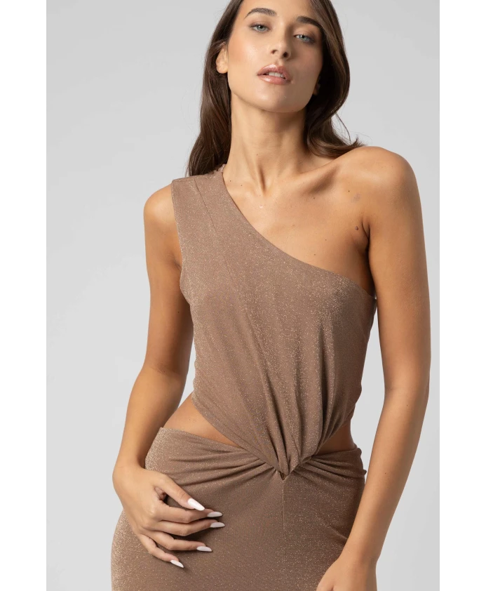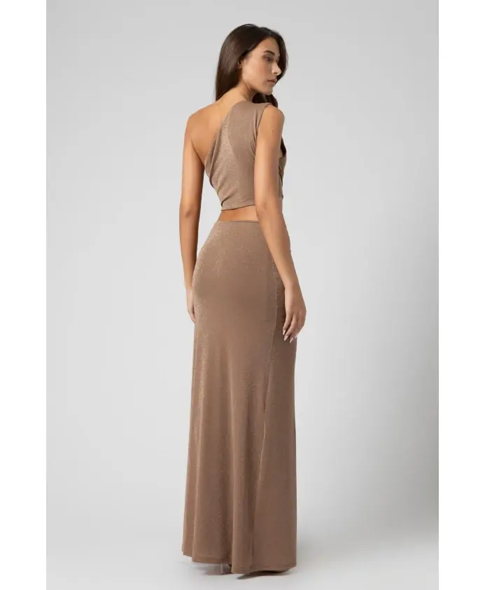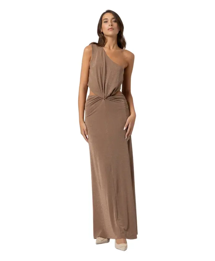 Платье Kocca REWENX - элегантное платье в пол с одним открытым плечом, завязанной, облегающей талией и прикрепленным прозрачным шарфом, созданное для вечерних мероприятий и особых случаев. Ключевые особенности: Цвет корица | Вискоза | Завязанная, облегающая талия | Прикрепленный прозрачный шарф | Вырез на одно плечо | Боковые вырезы | Струящийся подол | Асимметричный силуэт | Деталь из прозрачного шарфа | Размеры и посадка: Рост модели 175 см, размер S/42 | Состав ткани и уход: 65% вискоза | 15% полиамид | 15% металлизированное волокно | 5% эластан
