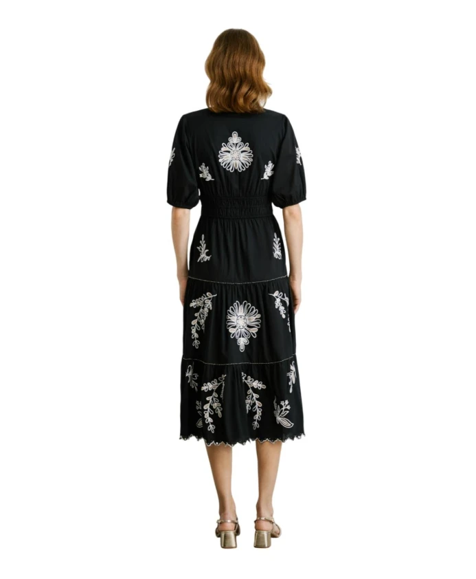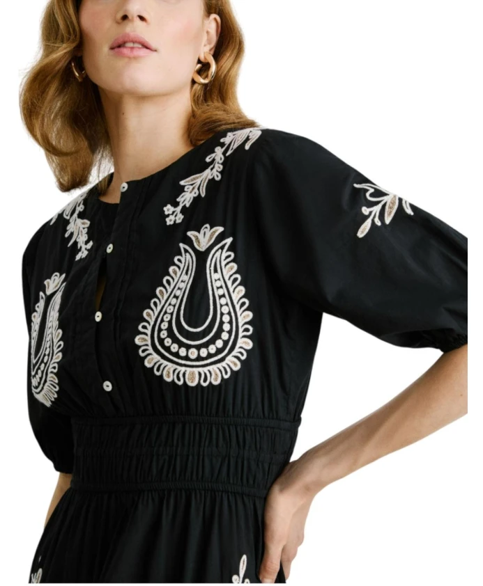 Подчеркните свой свежий и утонченный стиль с платьем Destiny от Pepe Jeans. Черное платье миди с белой вышивкой добавляет богемный шарм, делая его универсальным и элегантным вариантом для летних дней. Изготовленное из 100% хлопка, оно легкое, дышащее и комфортное. Платье имеет короткие пышные рукава для романтического образа, присборенную талию для подчеркивания силуэта и застежку на пуговицах для регулируемой посадки. Это платье идеально подойдет к сандалиям или эспадрильям для создания повседневного, но в то же время изысканного образа.