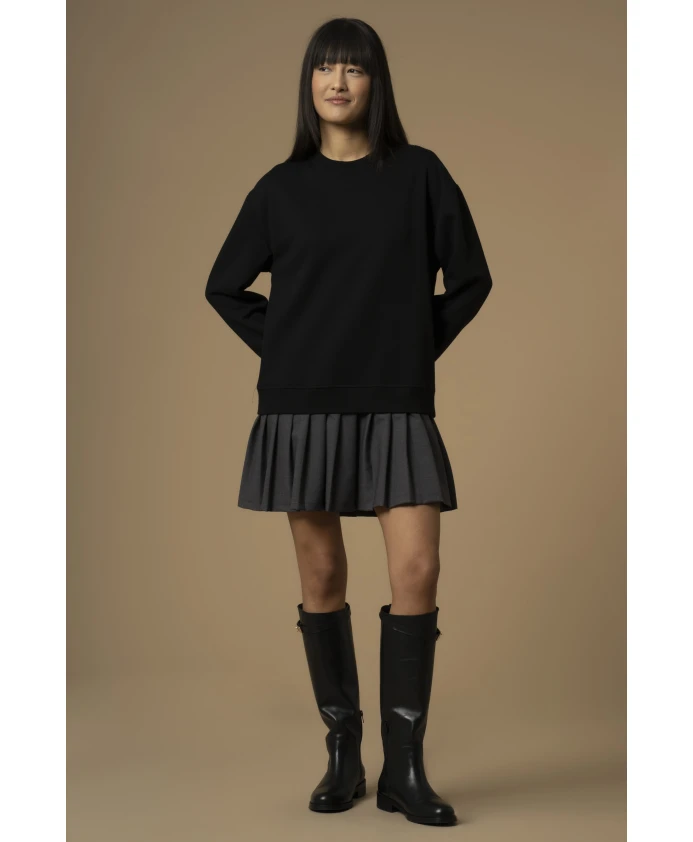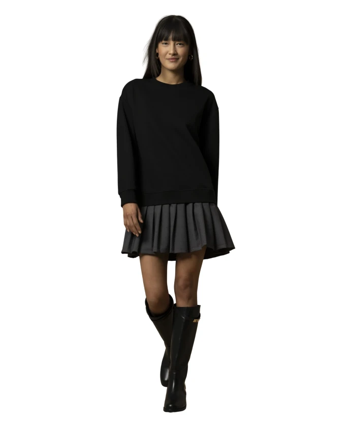 Платье Kocca ANAND сочетает в себе топ в стиле толстовки и плиссированную юбку длиной до бедра, создавая одновременно элегантный и непринужденный образ. Оно обеспечивает сбалансированное соотношение комфорта и структуры для простого дневного наряда. Ключевые особенности: Цвет: светло-серый | Черный | Хлопок | Эластичные манжеты | Пояс | Эффект плиссированной юбки | Топ в стиле толстовки | Длина до бедра | Размеры и посадка: Свободный крой | Рост модели 175 см, размер S/42 | Состав ткани и уход: 57% хлопок | 43% полиэстер