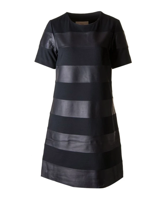Короткое кожаное платье А-силуэта от BTFCPH сочетает в себе мягкую овечью кожу наппа и трикотаж, обеспечивая эластичность и комфорт. Полосатая текстура и круглый вырез горловины делают его универсальным выбором как для дневных, так и для вечерних образов. Ключевые особенности: Черный | Овечья кожа наппа | Мягкая на ощупь | Эластичная ткань | Круглый вырез | Короткие рукава | Полосатый узор | Силуэт А-силуэт | Размер и посадка: Стандартный | Состав и уход за тканью: 50% овечья кожа наппа | 50% трикотаж
